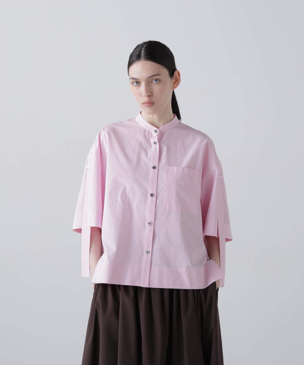 シルエットはややルーズでバンドカラーのシャツデザインになります。