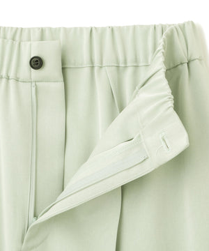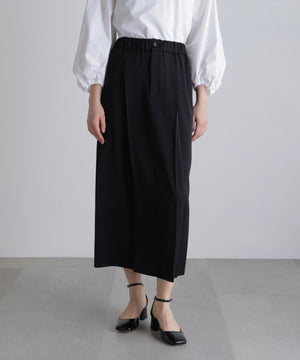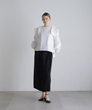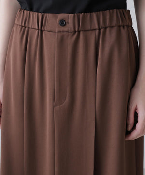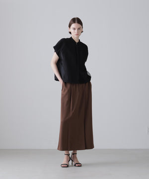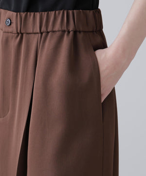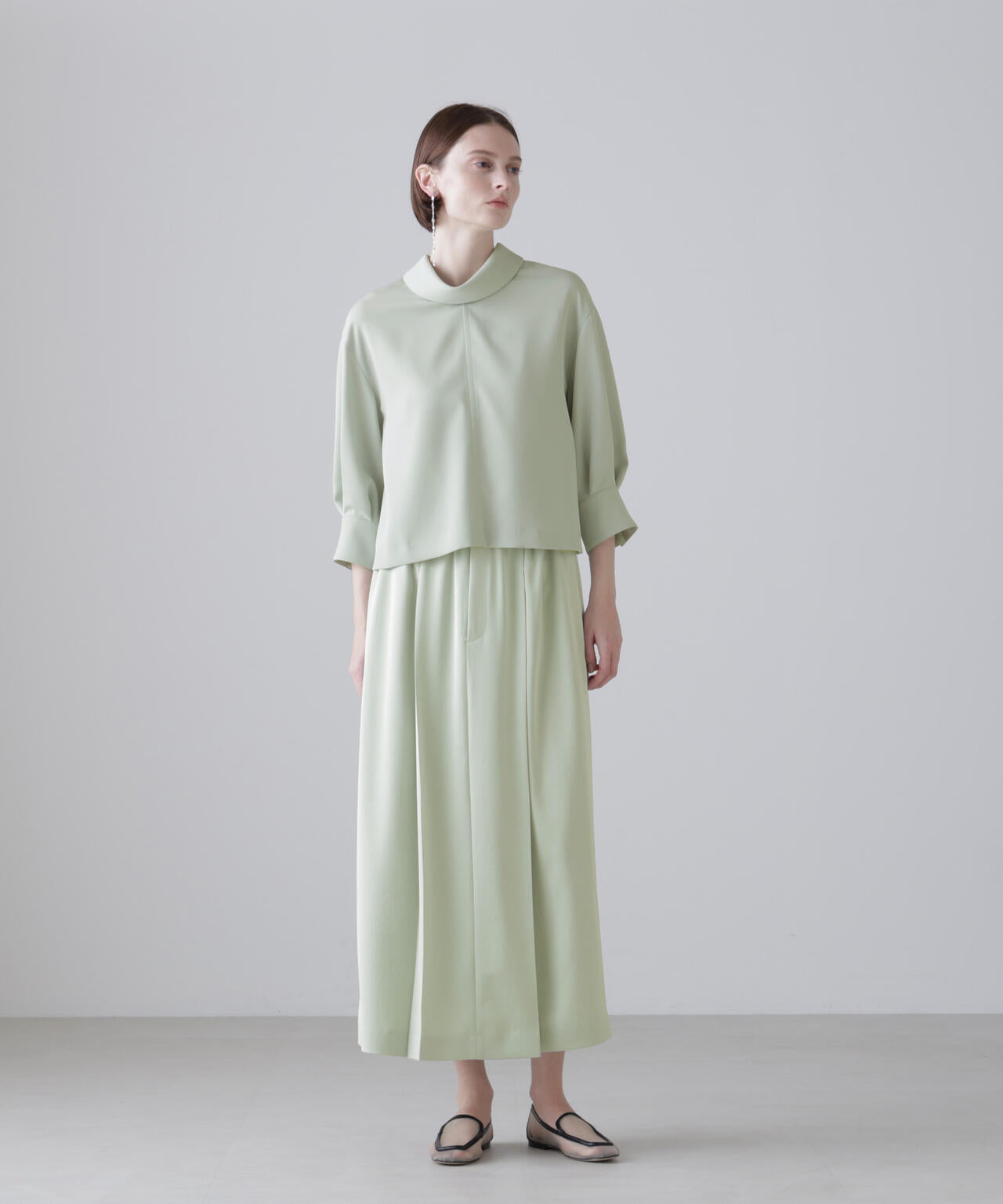 緯糸にストレッチ性の糸とアセテートを合撚することでドライタッチで特有の光沢感とドレープ性が特徴なサテンを、タンブラー加工しナチュラルなシワ感をつけた素材で仕立てました。