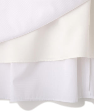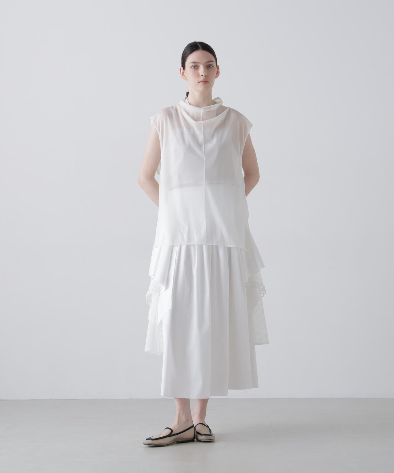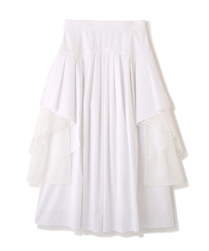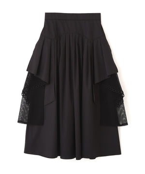 タックをふんだんに入れたスカートでサイドに共地のラッフルと裾にレースをあしらったメッシュ生地がついたボリューミーでフェミニンな1枚です。
