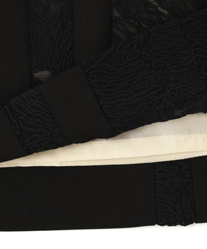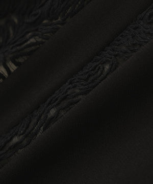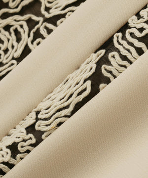 ドライなタッチが特徴なポリエステルを使用した、ドレープ性に富んだ素材と大胆に太番手糸を束ねてモチーフを刺繍した素材を組み合わせて仕立てました。
