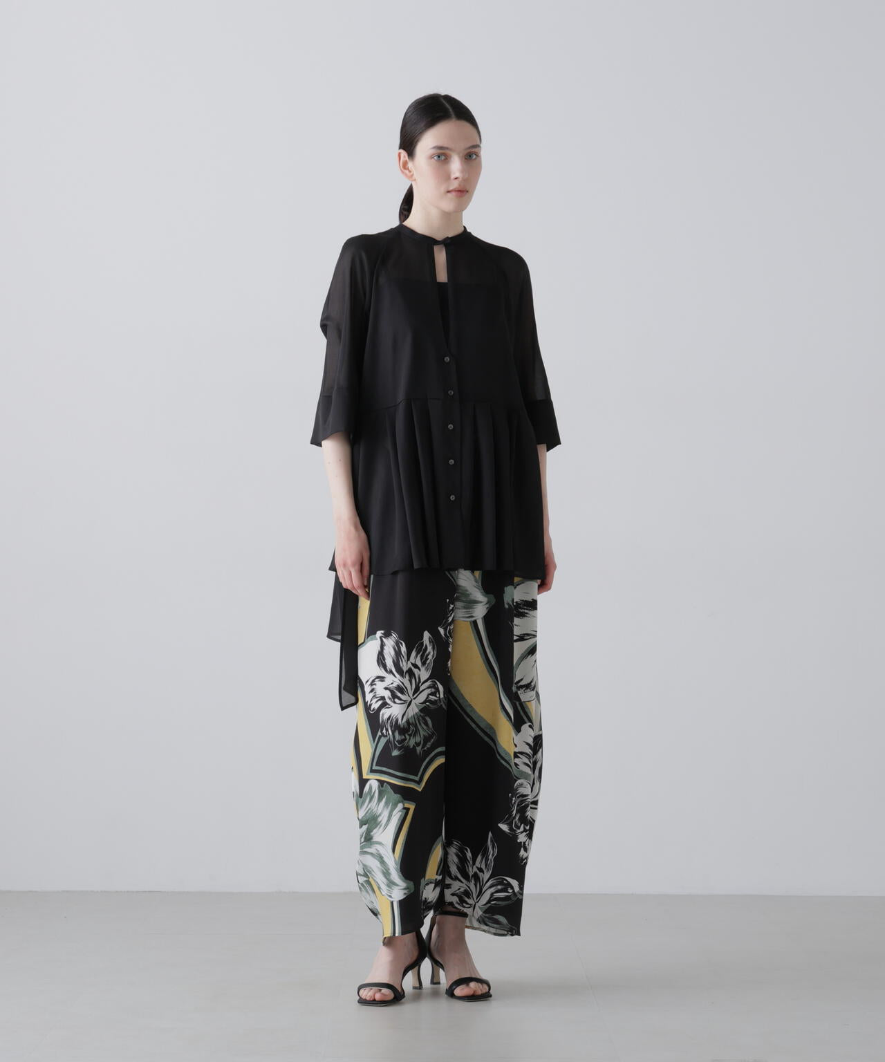 しなやかなドレープ性のあるジョーゼット素材に、大胆な構図のプリントを施した素材で仕立てました。