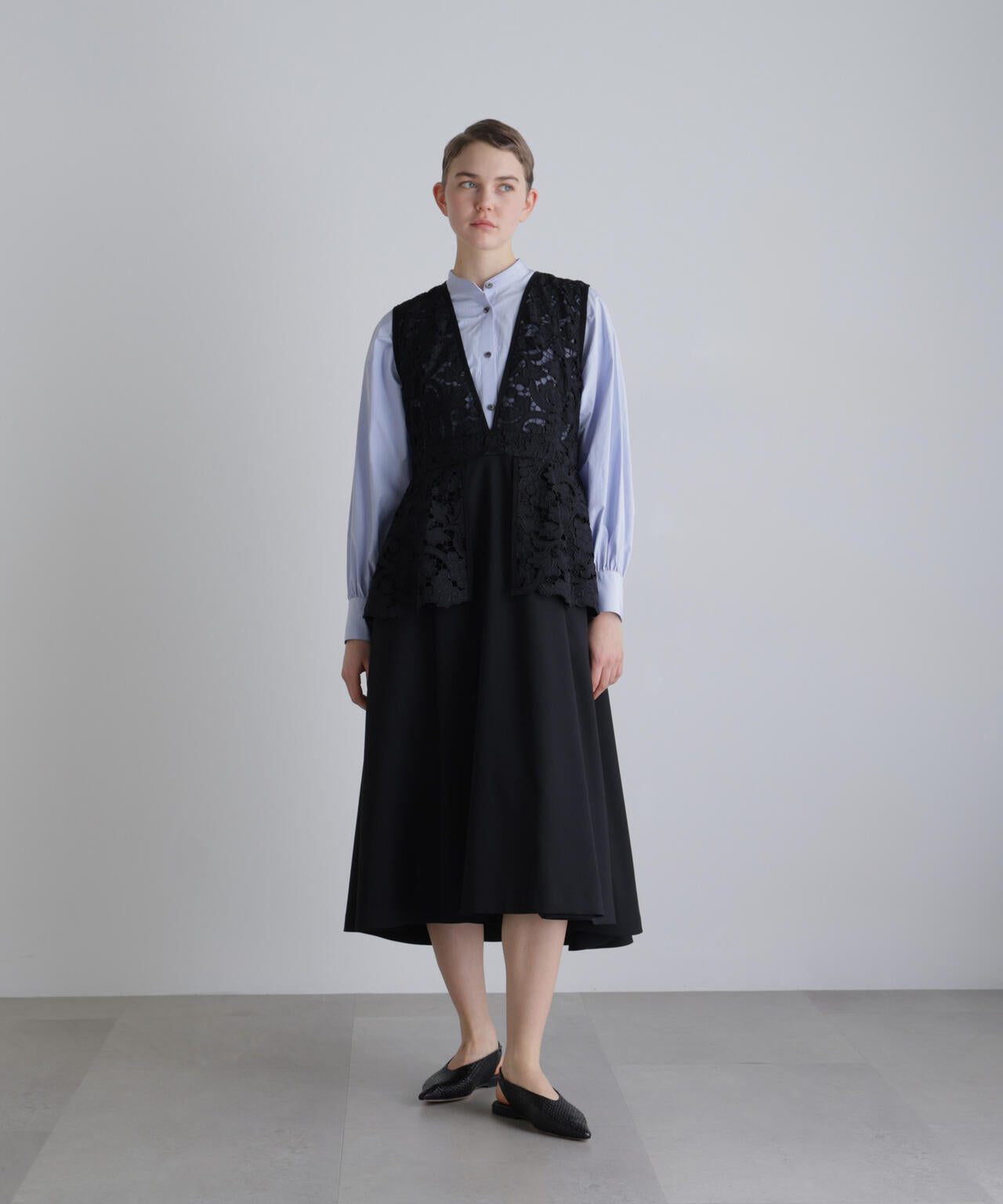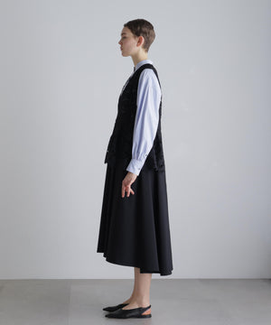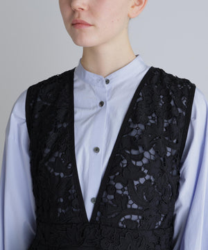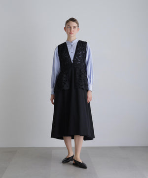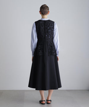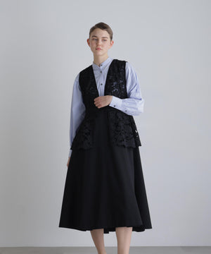 ふくらみのある太番手ポリエステル糸を使用し、盛るようにモチーフを刺繍したケミカルエンブロイダリーレースと、反発感と伸縮性のある、ドレープ性に富んだ素材で仕立てました。