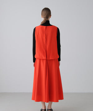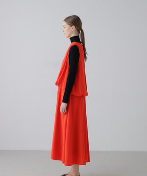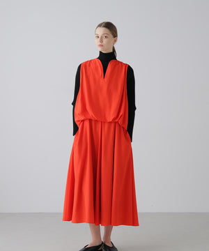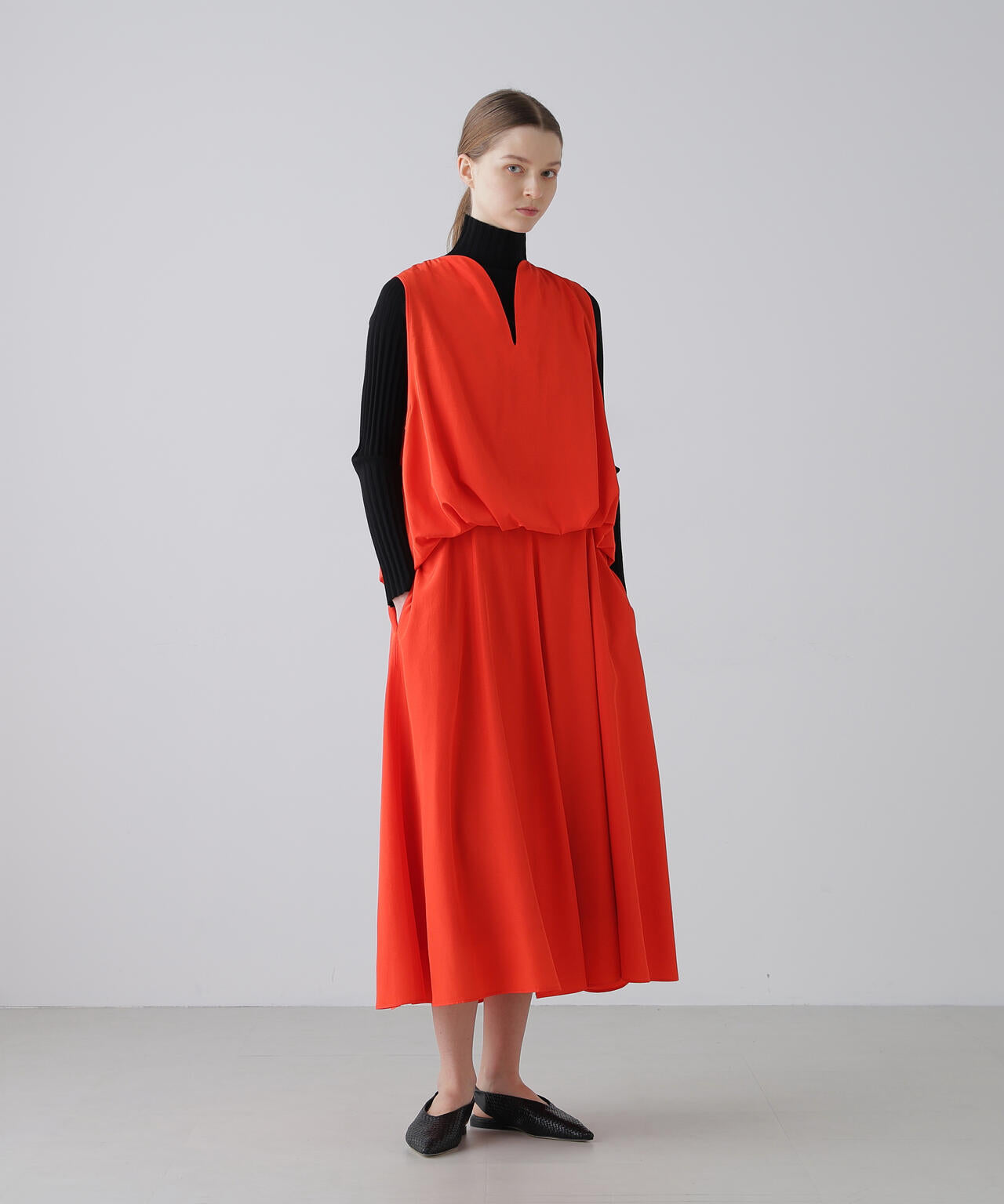 たっぷりフレアをとったスカート部分がフェミニンな印象で襟ぐりは柔らかいカーブを描くカッティングになっています。