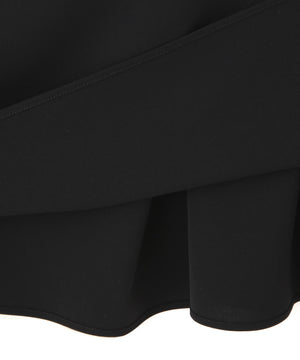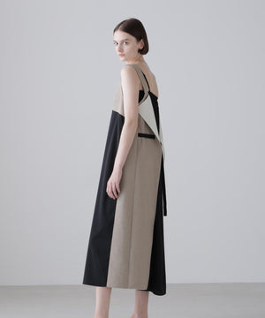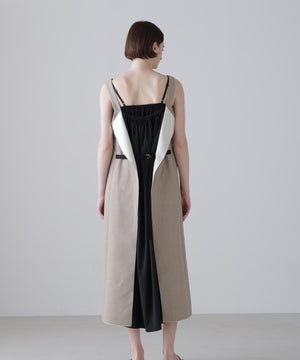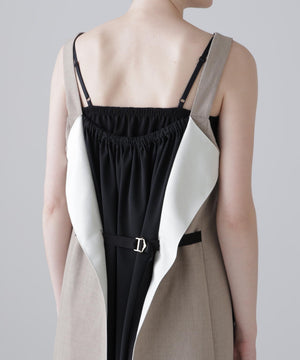 ミニマムなフロントスタイルと対照的にバックスタイルは2つの素材のレイヤードスタイルでがらりと印象の違う1着です。