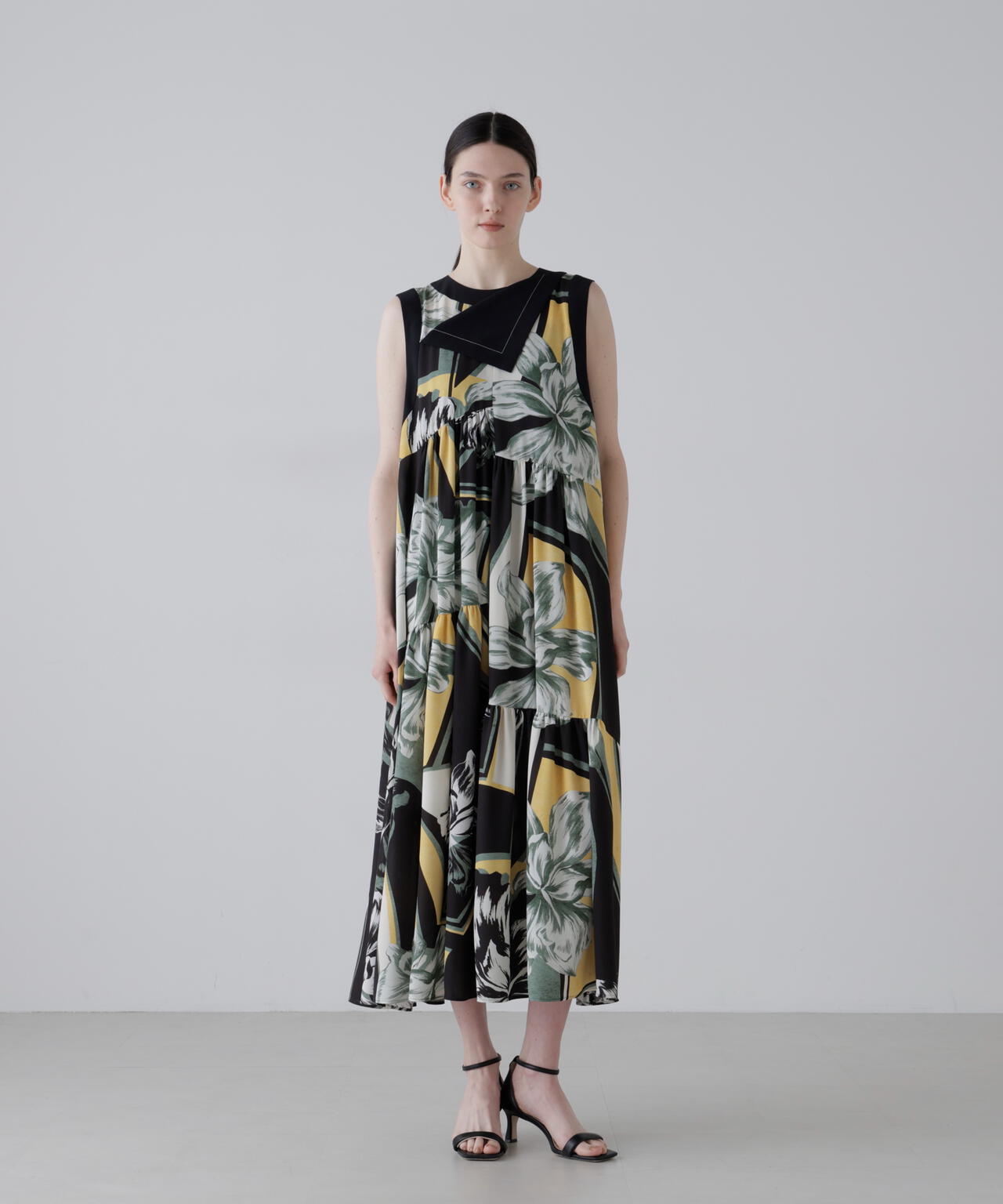 ランダムな段切り替えのティアードデザインのドレスで襟物の折り返しデザインが特徴のリラックス感のあるアイテムです。
