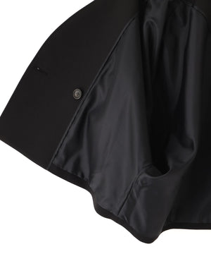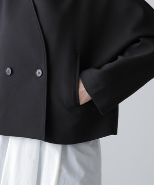 程よい厚みと独特なハリ感の合繊素材を使用したダブルのノーカラージャケットになります。