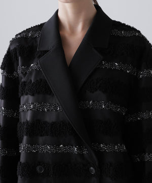 チュールベースの素材に膨らみのある糸や華やかな糸をボーダー状に刺繍した素材で仕上げられたジャケットです。