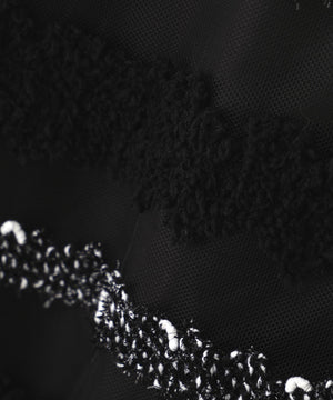 ポリエステルチュールに膨らみのあるモール糸や、杢調のラメ混糸で大胆にボーダー状に刺繍をした素材で仕立てました。