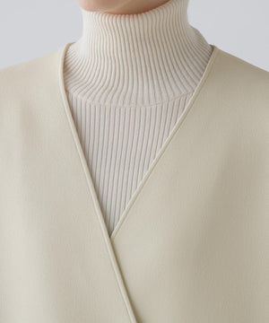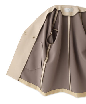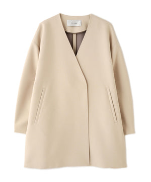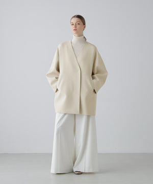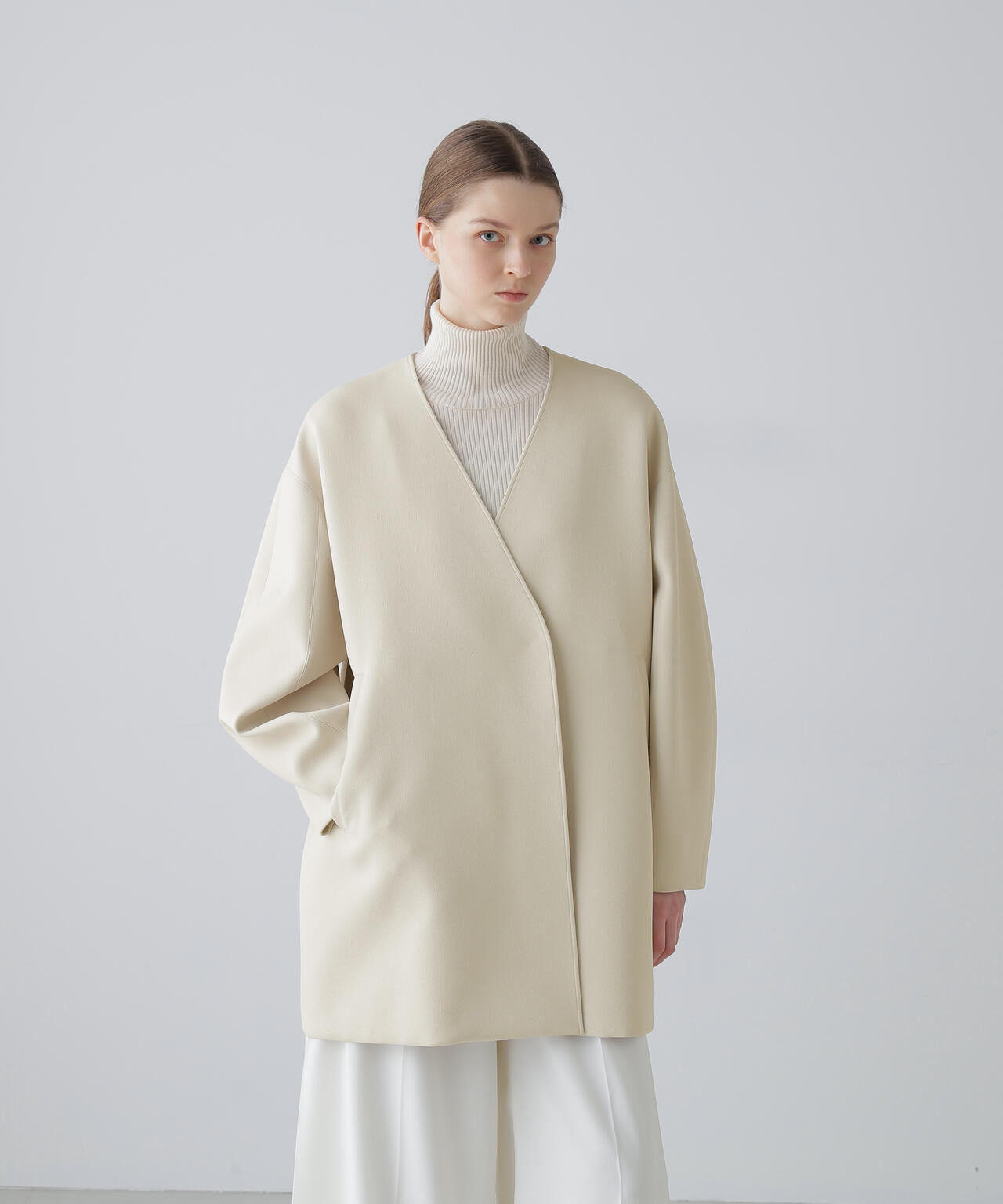 同じ生地を2枚配色で貼り合わせたボンディング素材で仕上げられたノーカラーコートです。