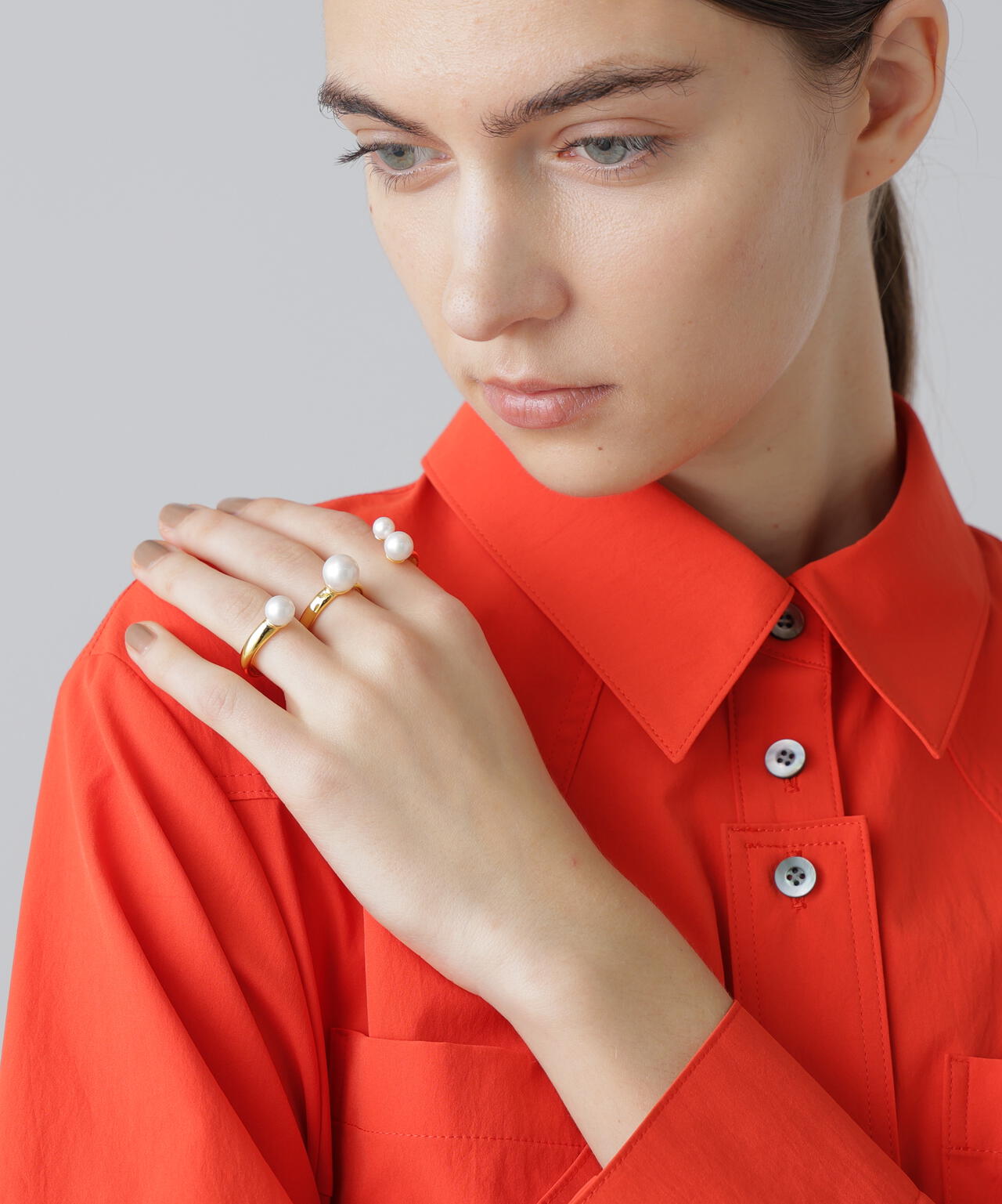 装着するとあまりリングの部分が見えないのでパールだけ指にのっているような浮遊感のあるデザインです。