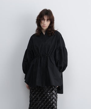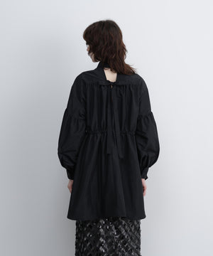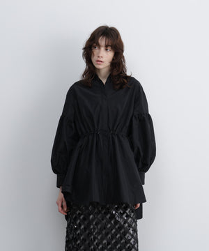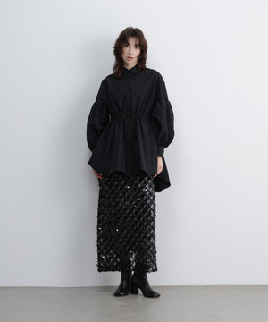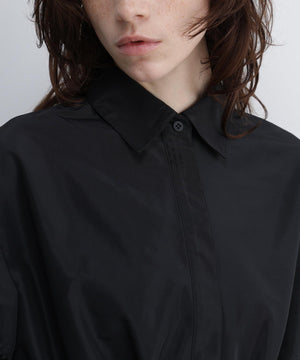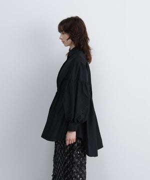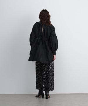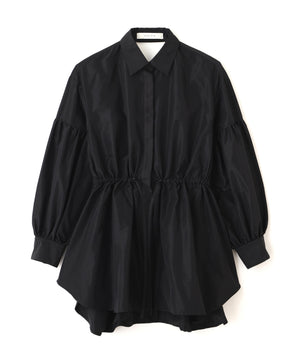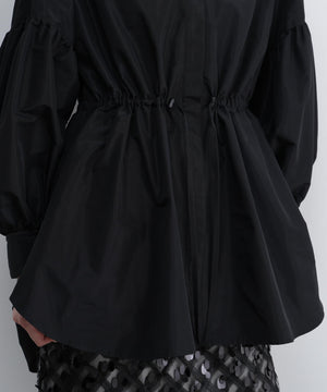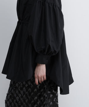 シャイニーな光沢のタフタ素材で仕上げられたデザインブラウスです。