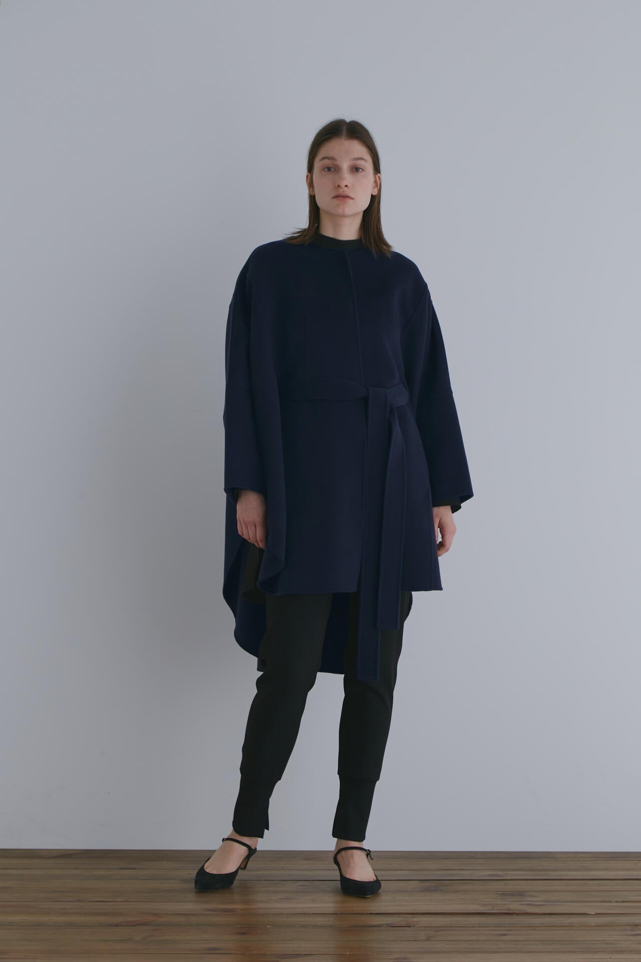 LE PHILで毎年大人気のポンチョコート。優しく丸みのあるヘムラインのカッティングが特徴で、贅沢に生地を使用したフレアシルエットが美しい一枚です。しっとりと柔らかなタッチと軽さで、包まれるような優しい着心地を実現した大人のためのコートです。付属の共布ベルトを内側から通すことで、前身頃はスッキリと着用いただけます。