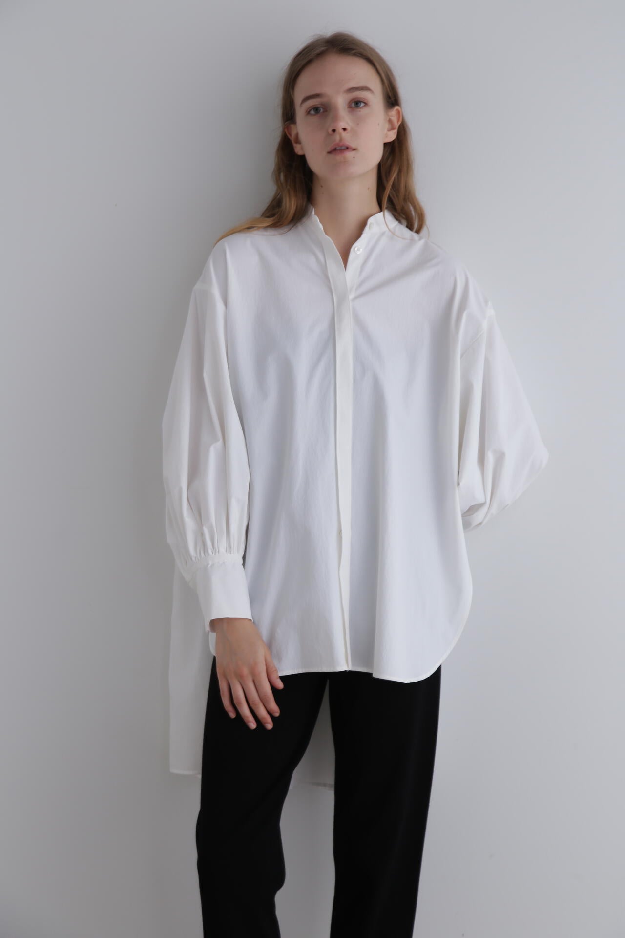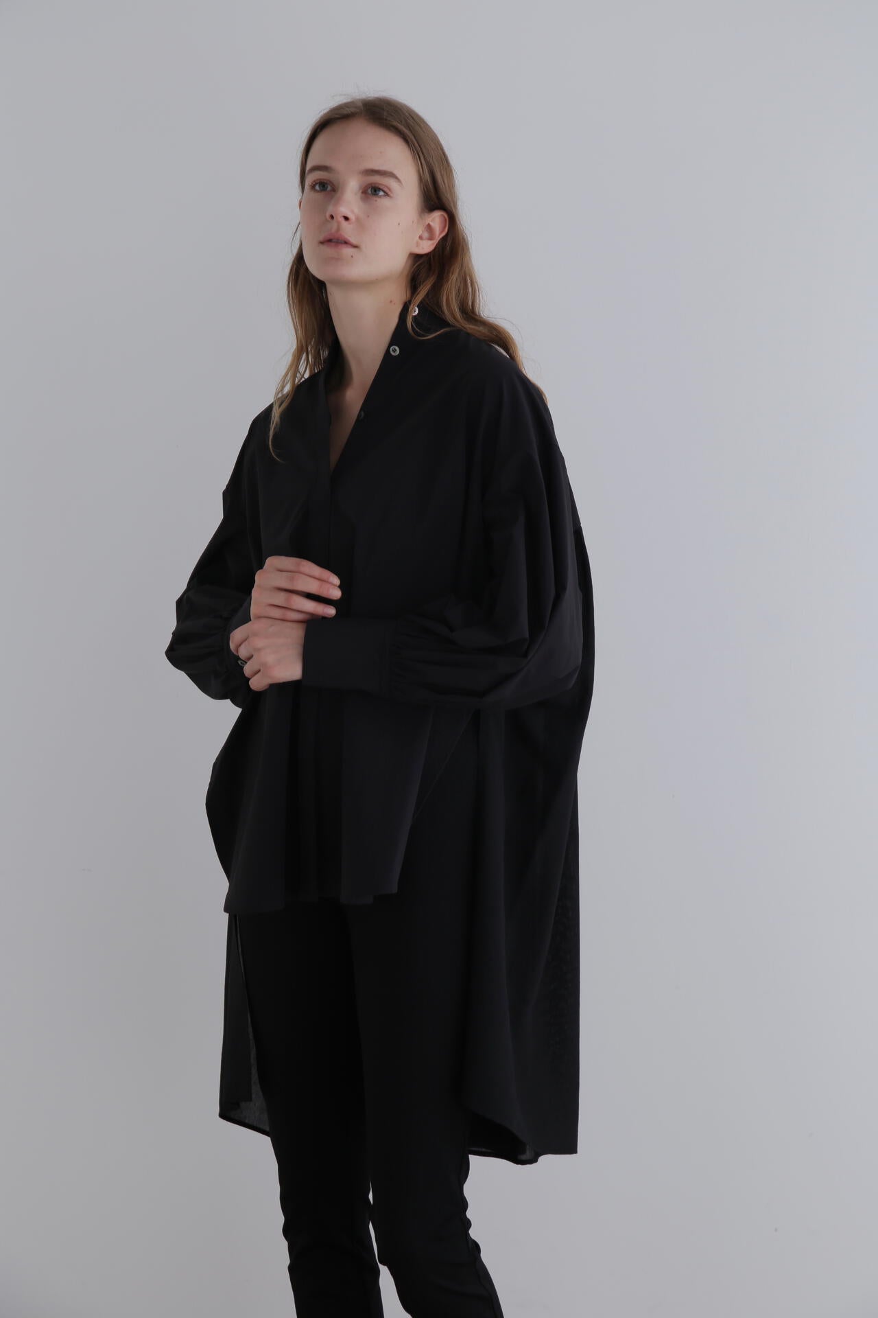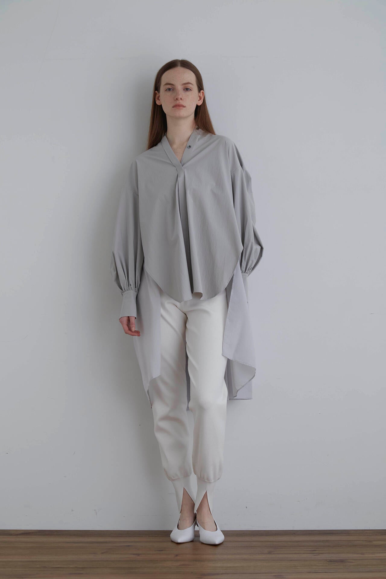 スタンドカラーの端正な雰囲気もありながら、たっぷりと贅沢に生地を使用しドラマティックなシルエットを楽しんでいただけるブラウスです。