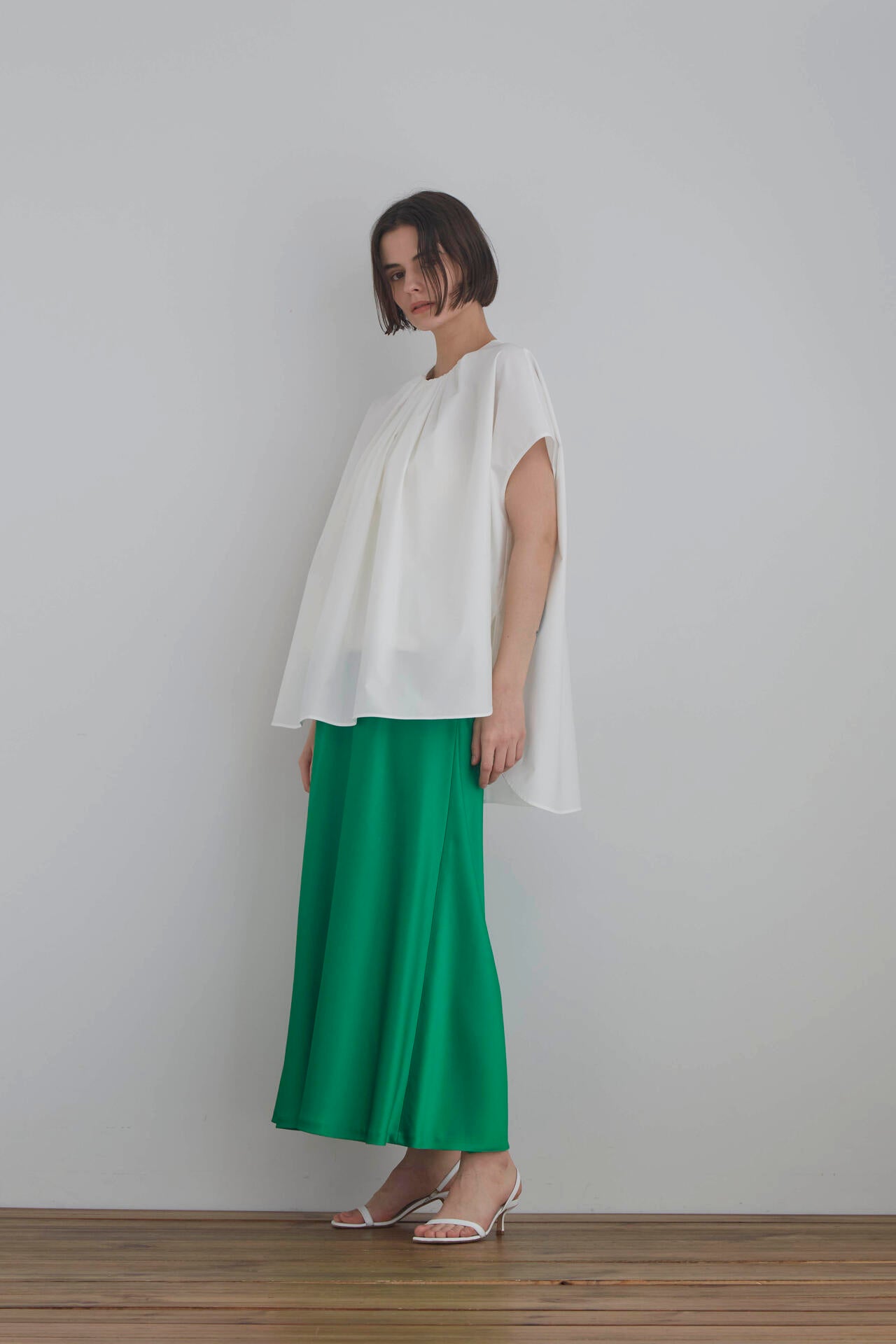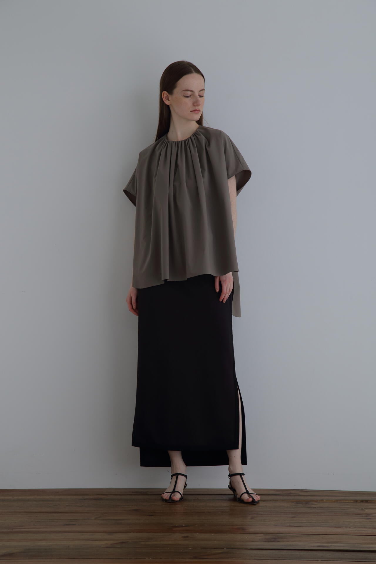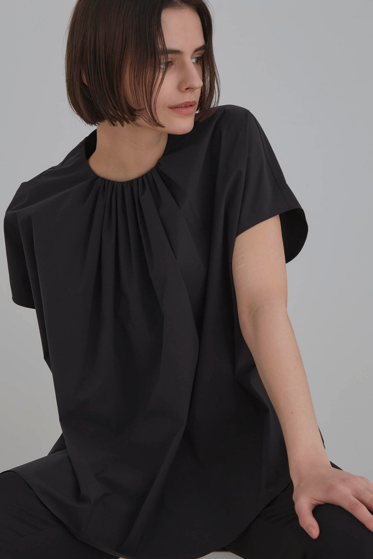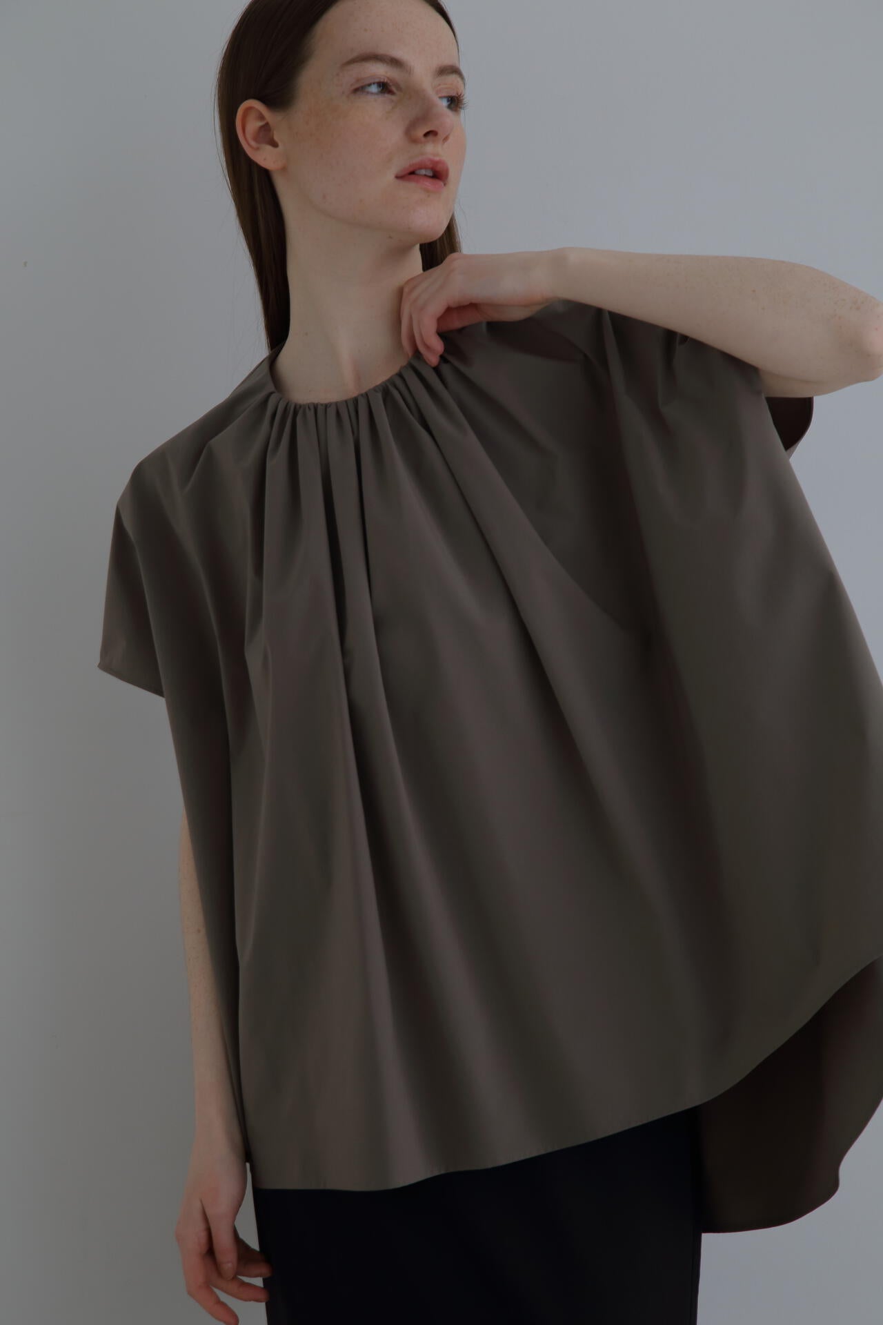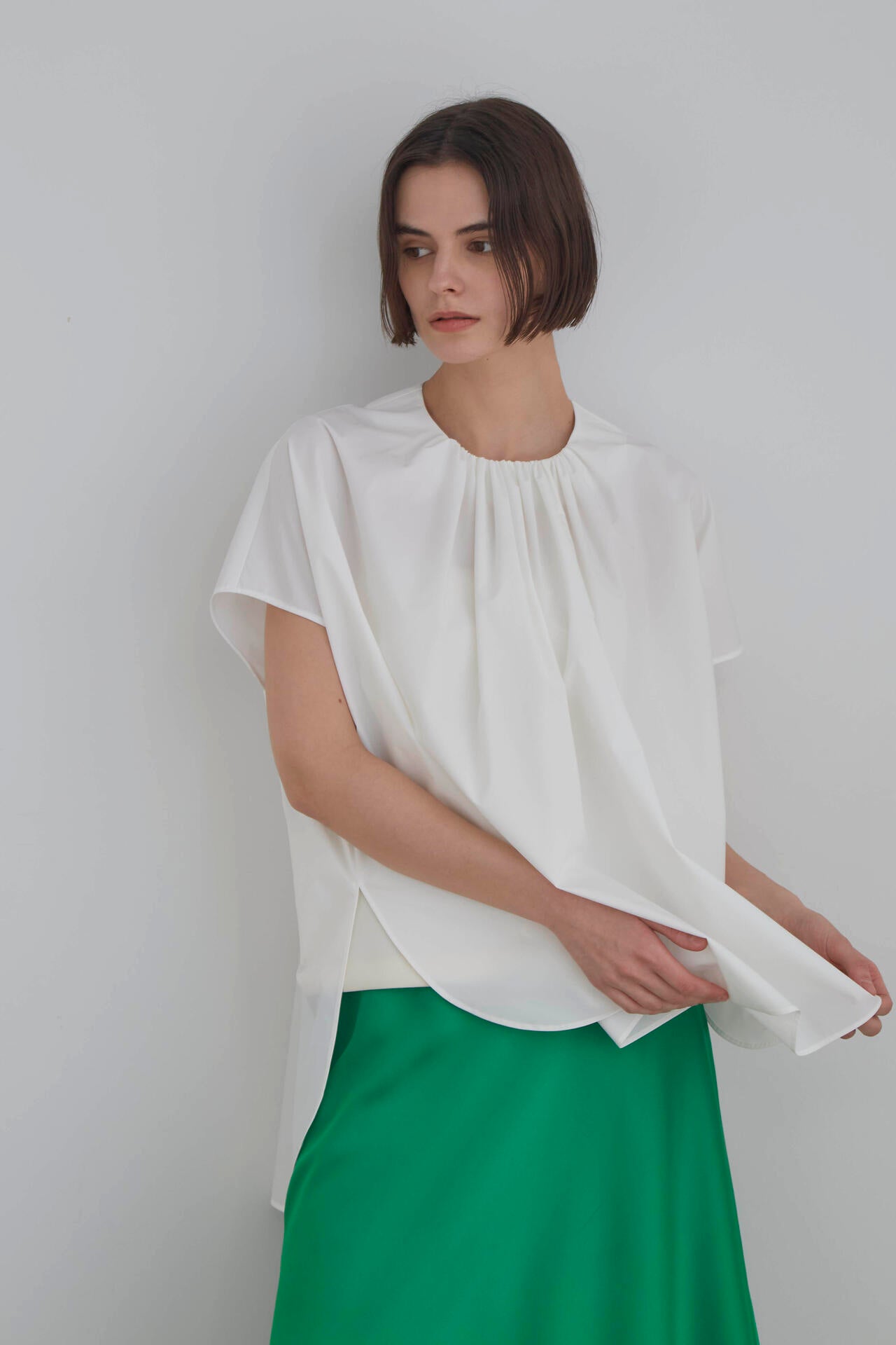 えりぐりにギャザーを加え、甘すぎない印象のシンプルモダンな1着です。