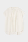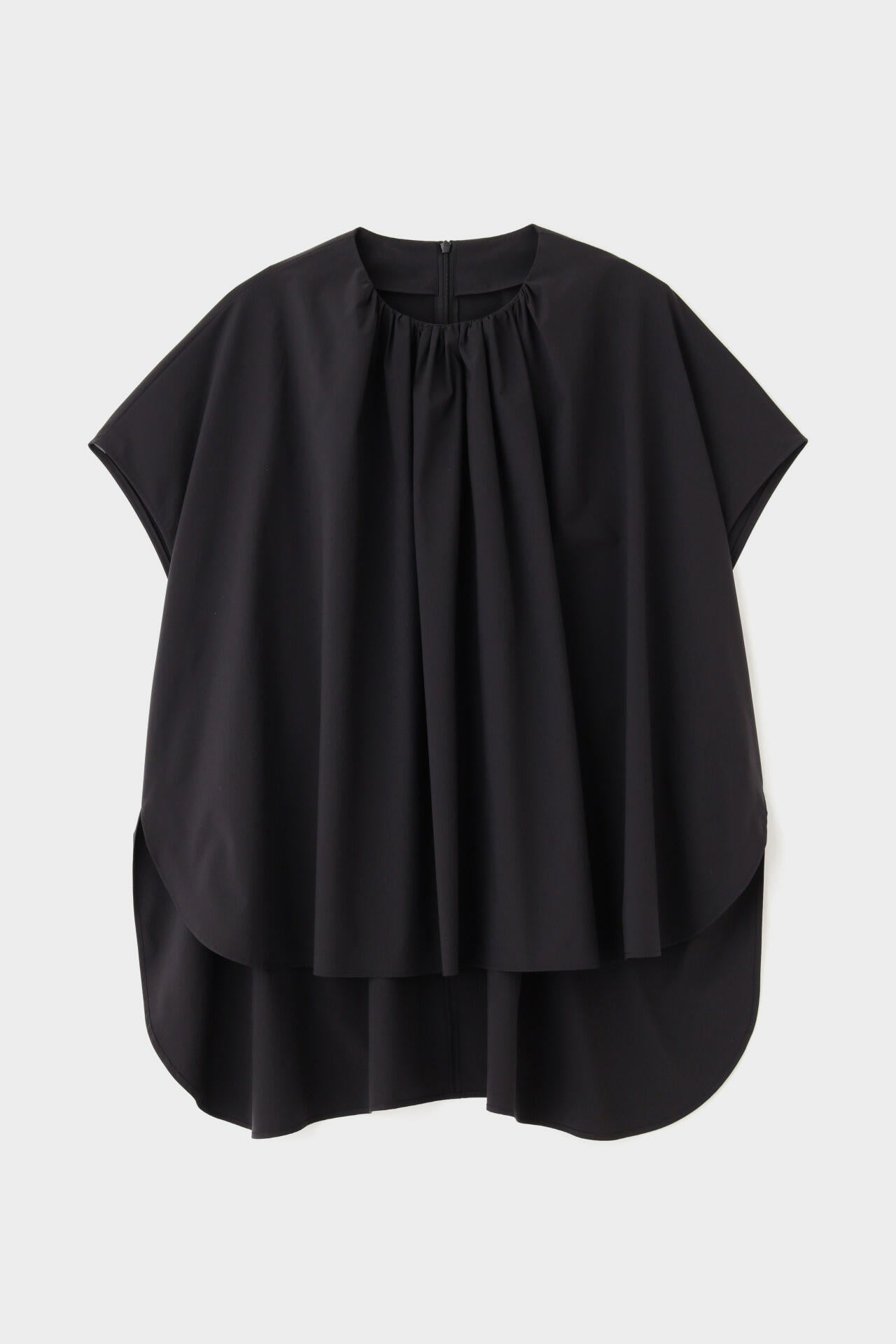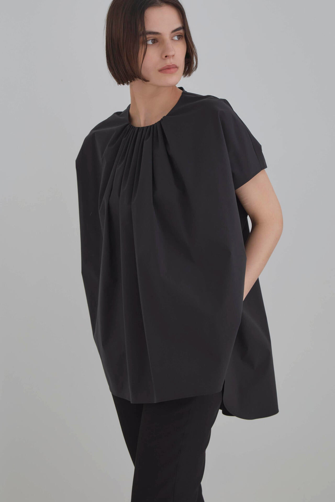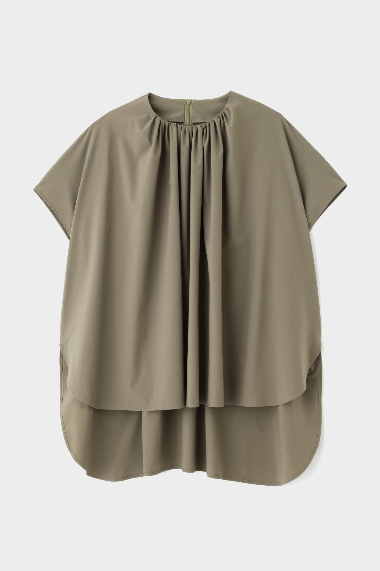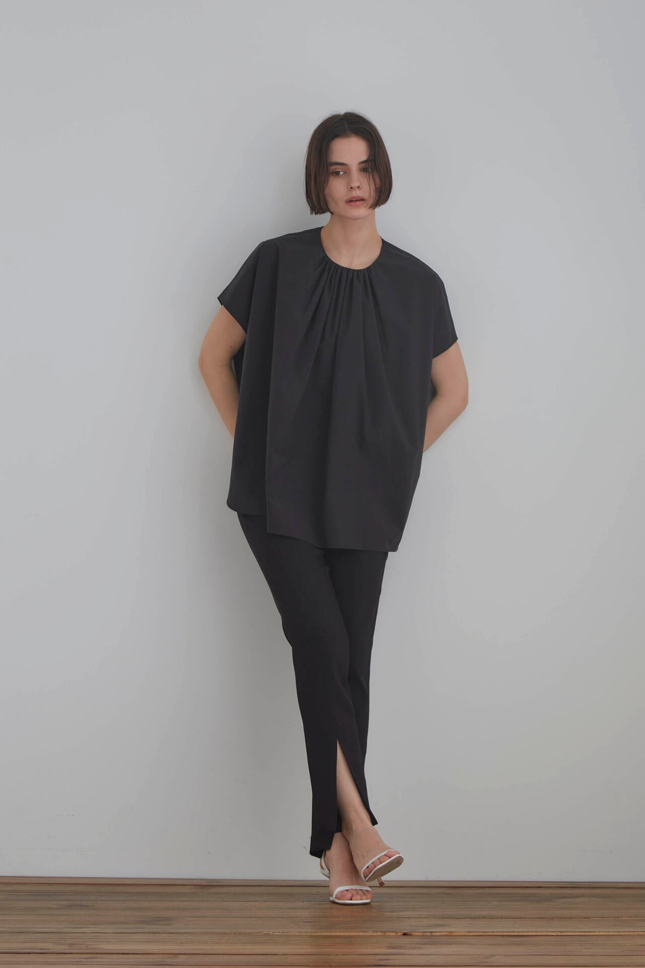 えりぐりにギャザーを加え、甘すぎない印象のシンプルモダンな1着です。