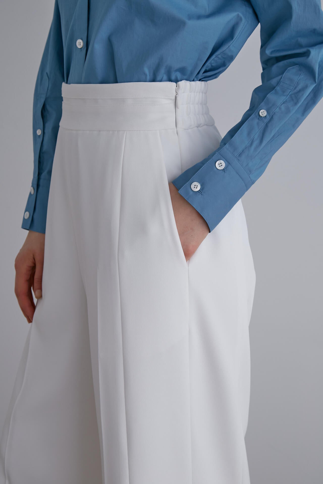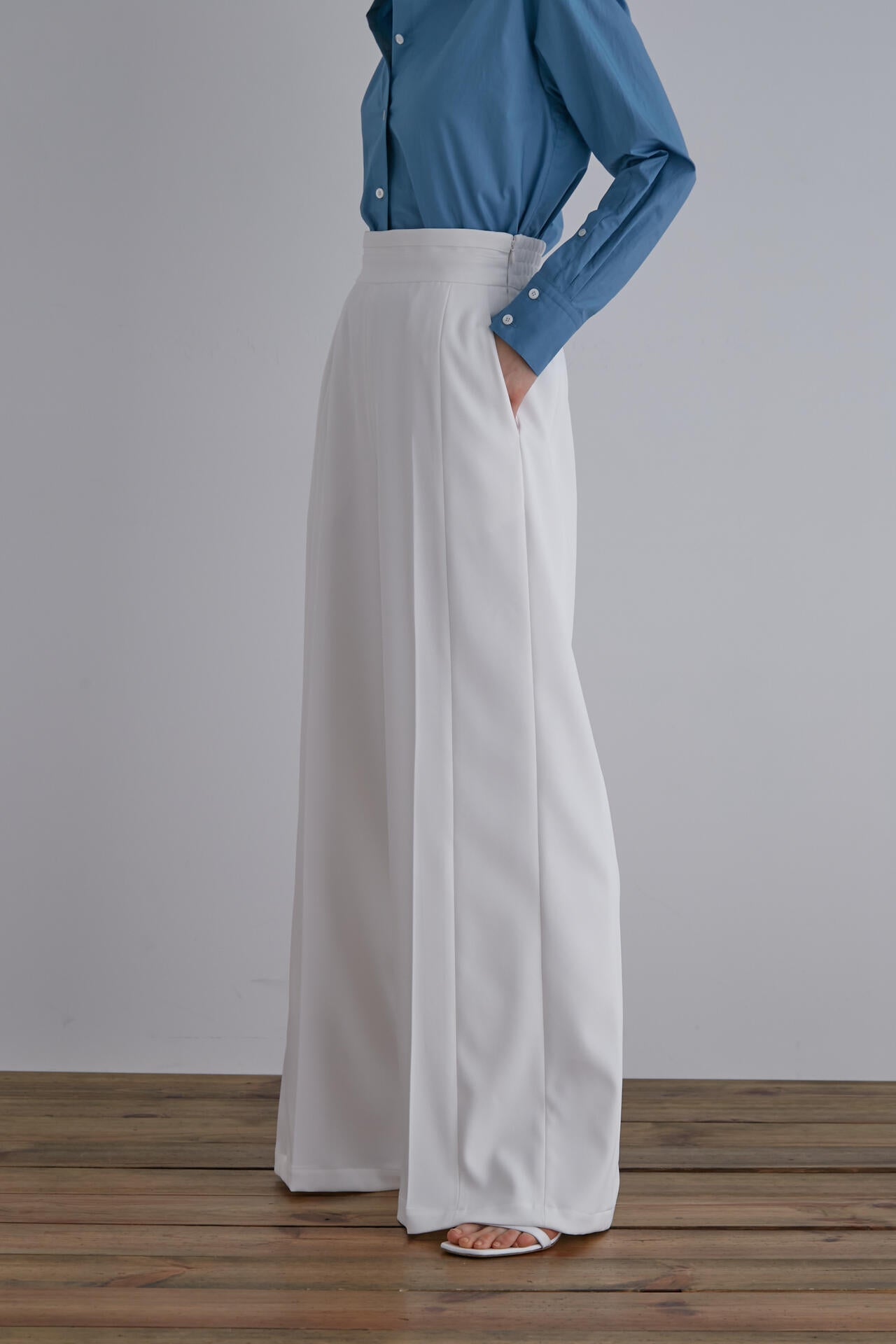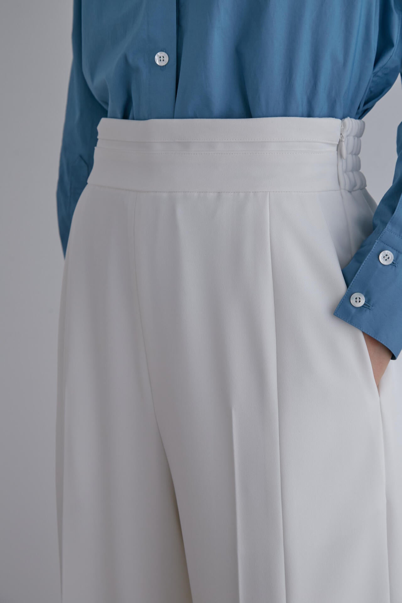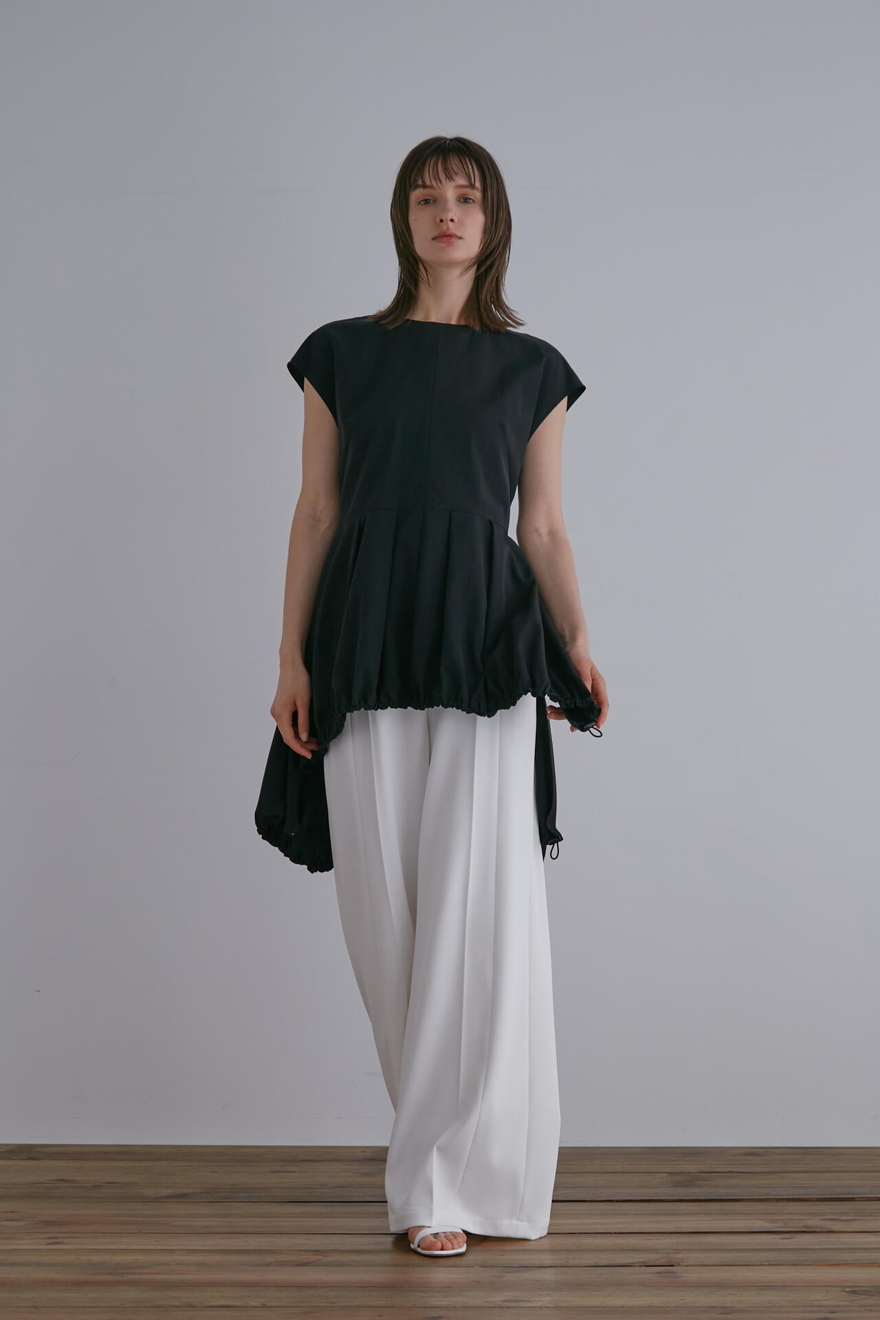 フロントのタックが立体的なシルエットを生み出し、美しいドレープ感を演出します。