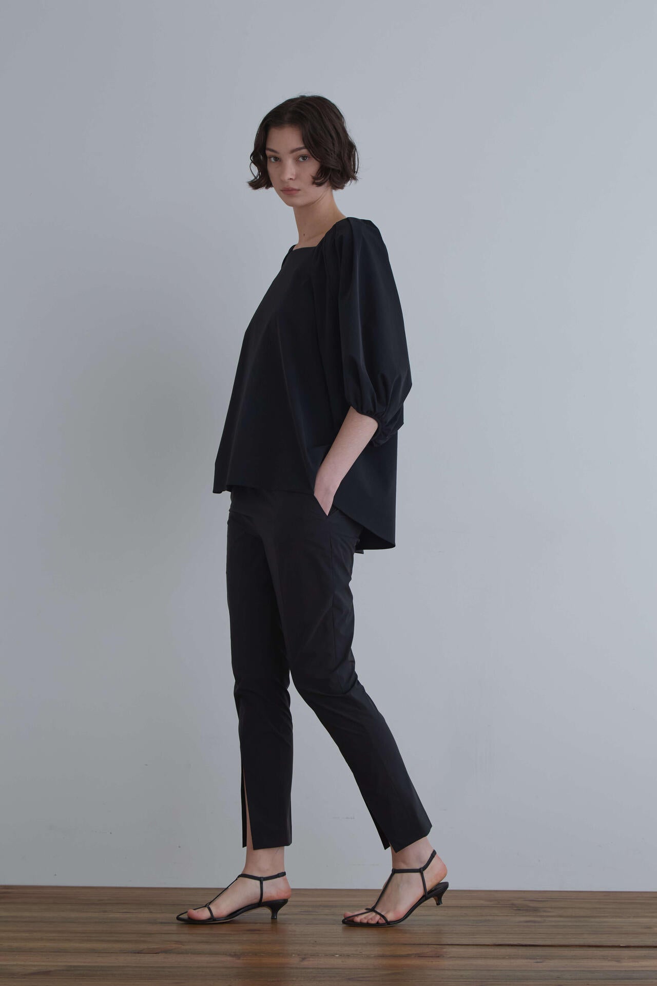 ストレッチ性のあるアクティブな素材で仕立てることで、デザインの甘さを中和させ、モード感をプラスしました。