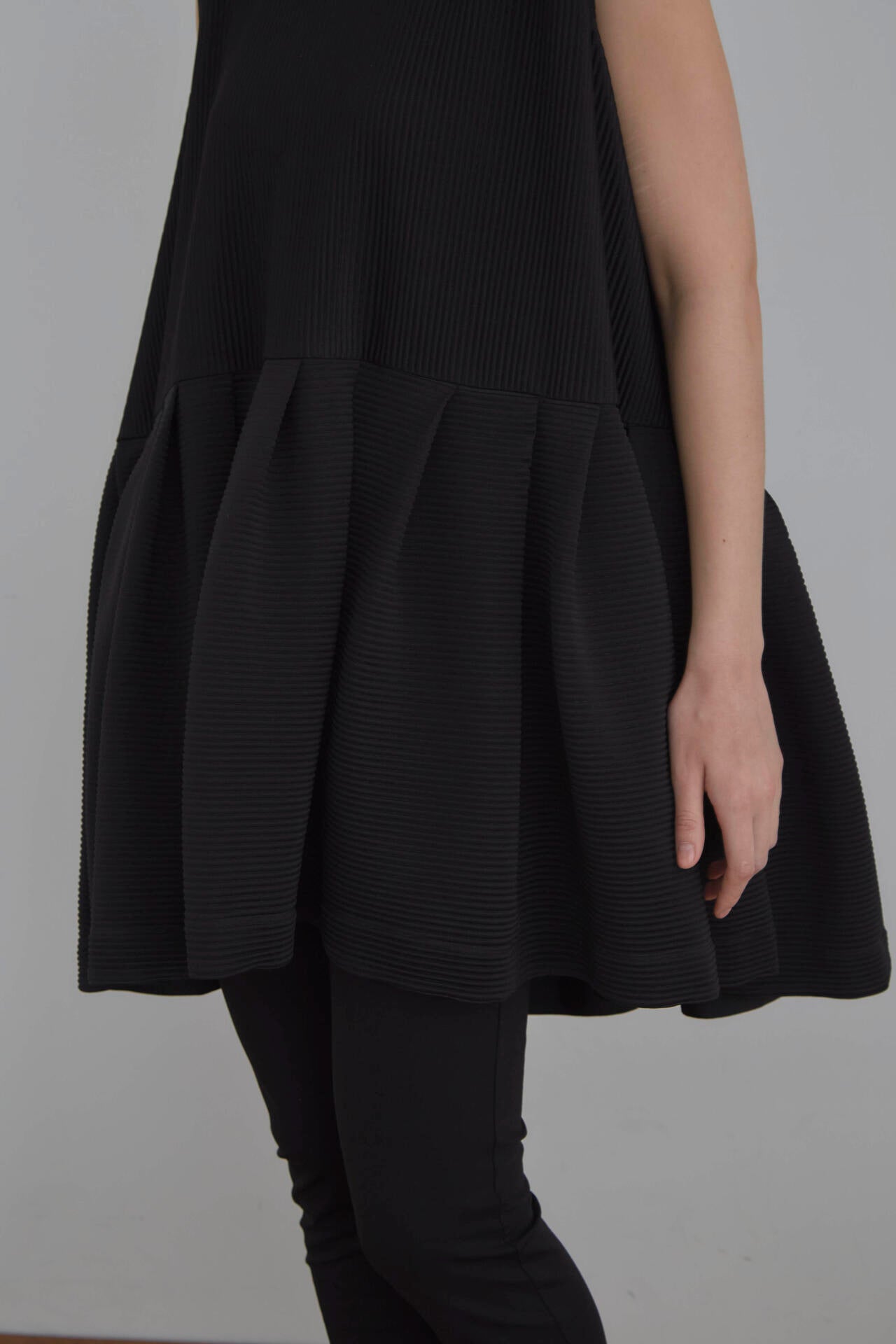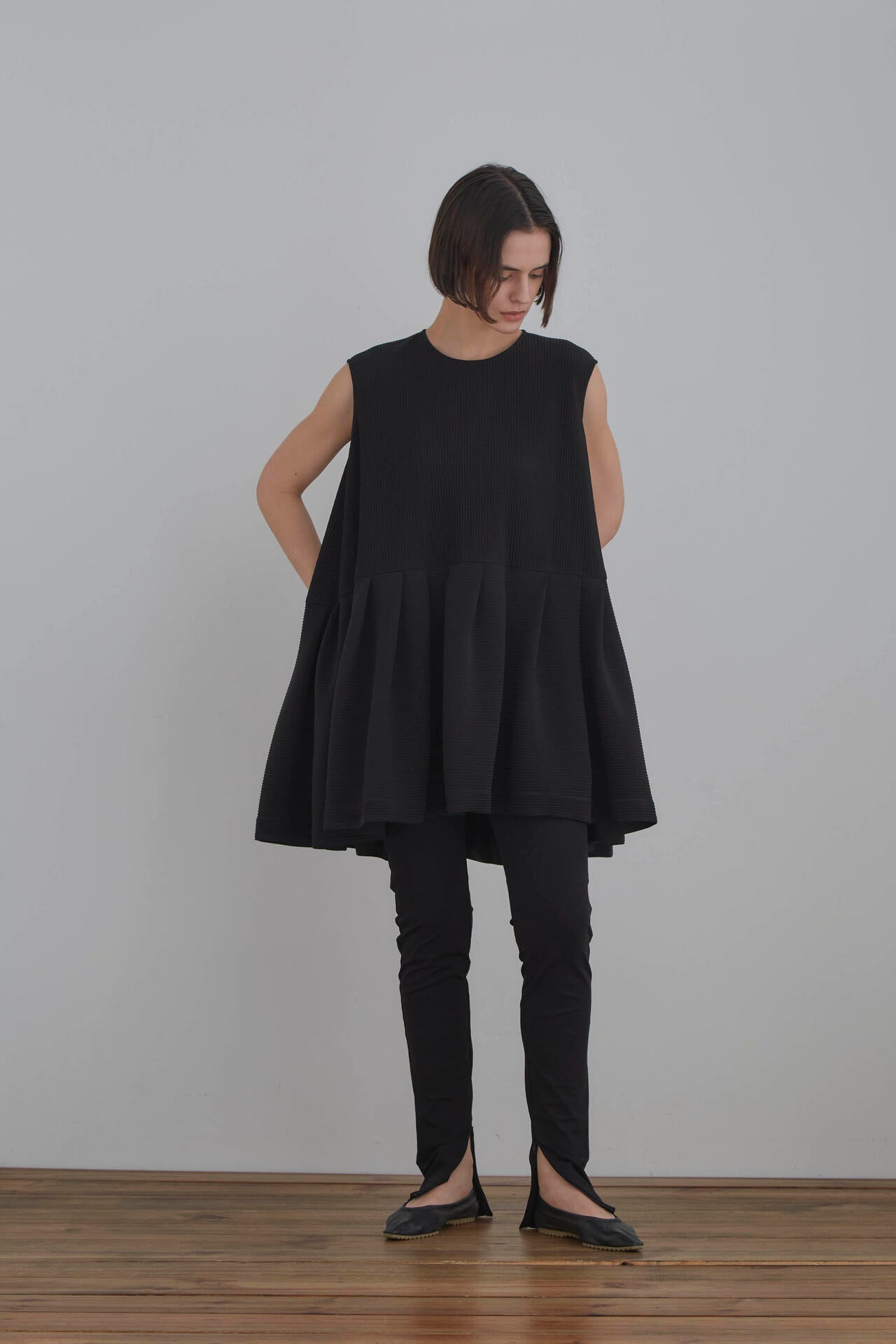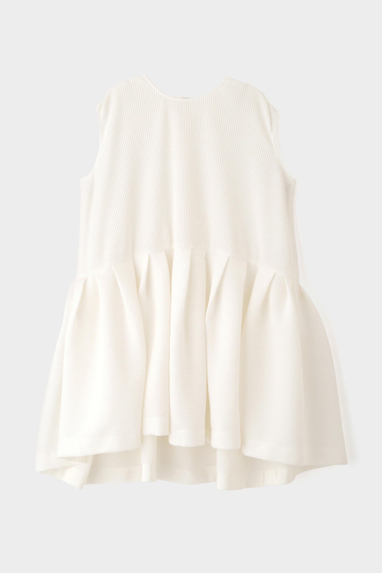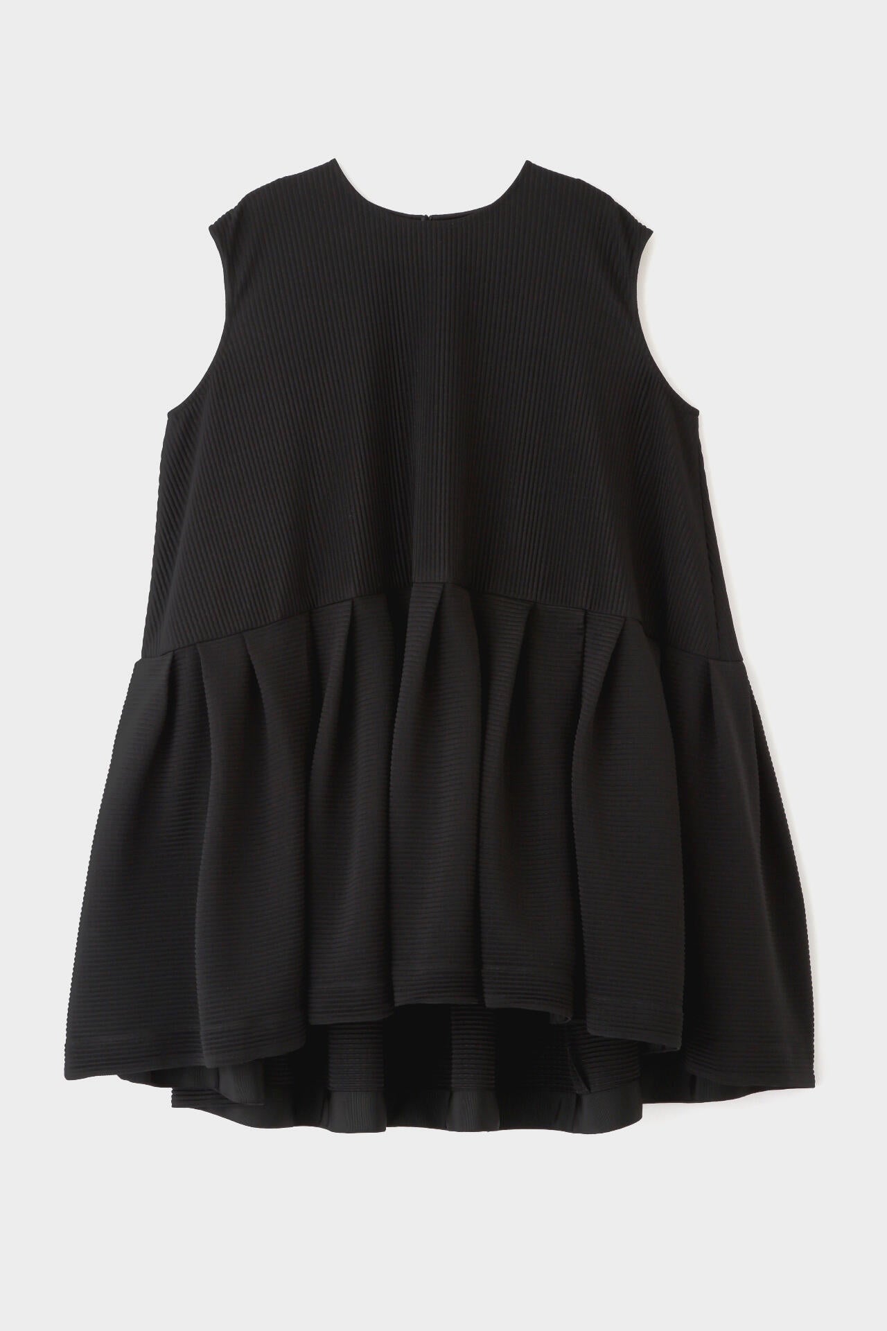 伸縮性があり、さらりとしたジャージ素材に、生地の段階で細かな畝をプリーツ加工のように熱で型押した素材です。