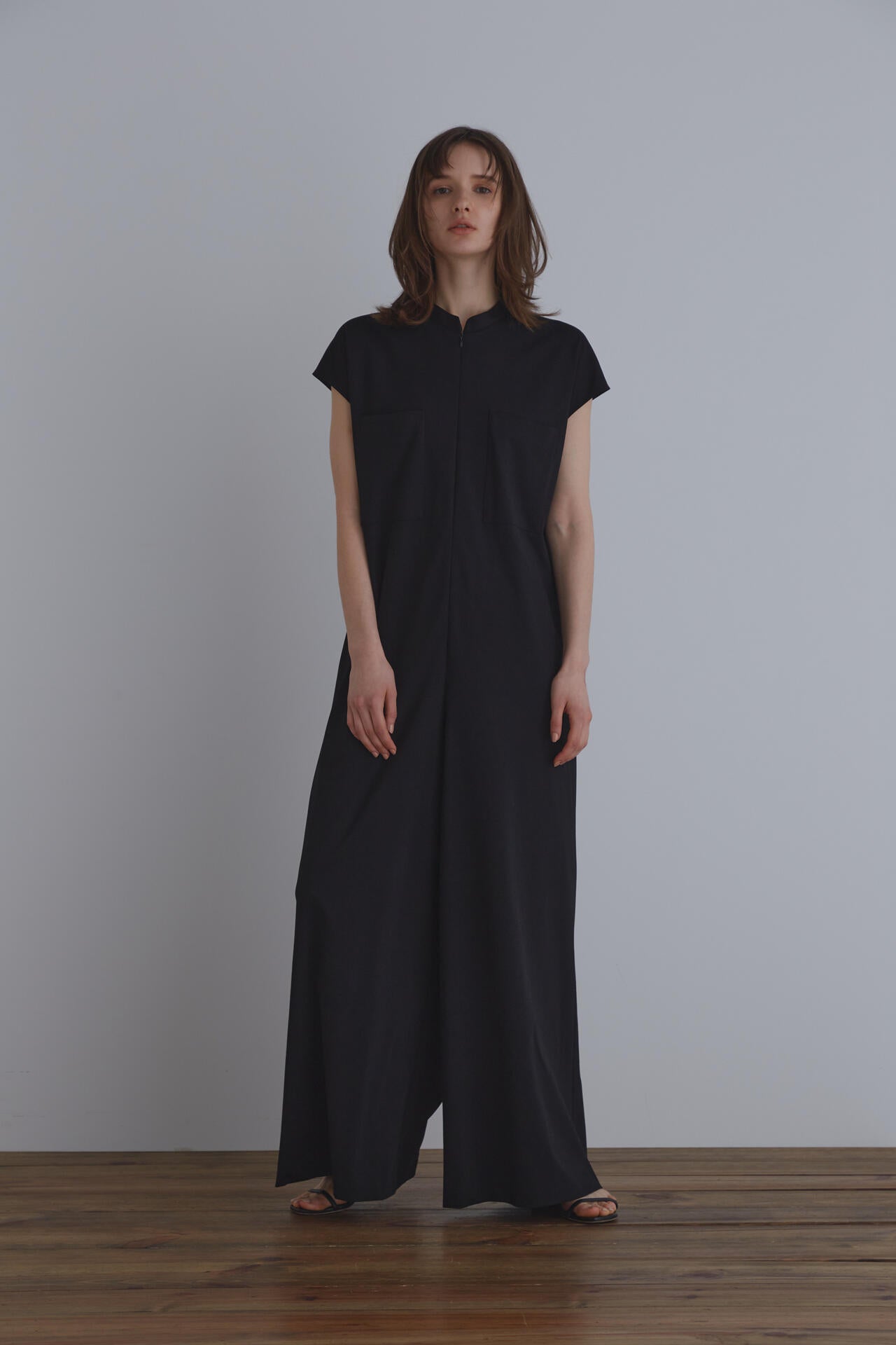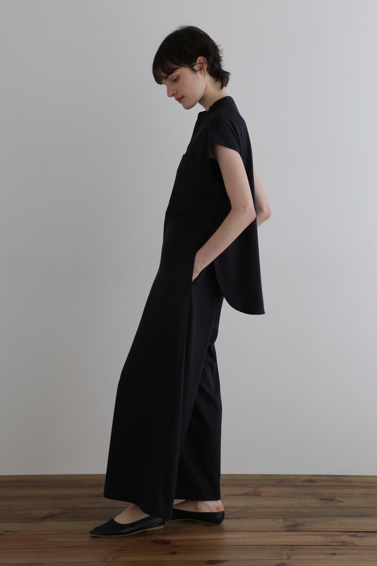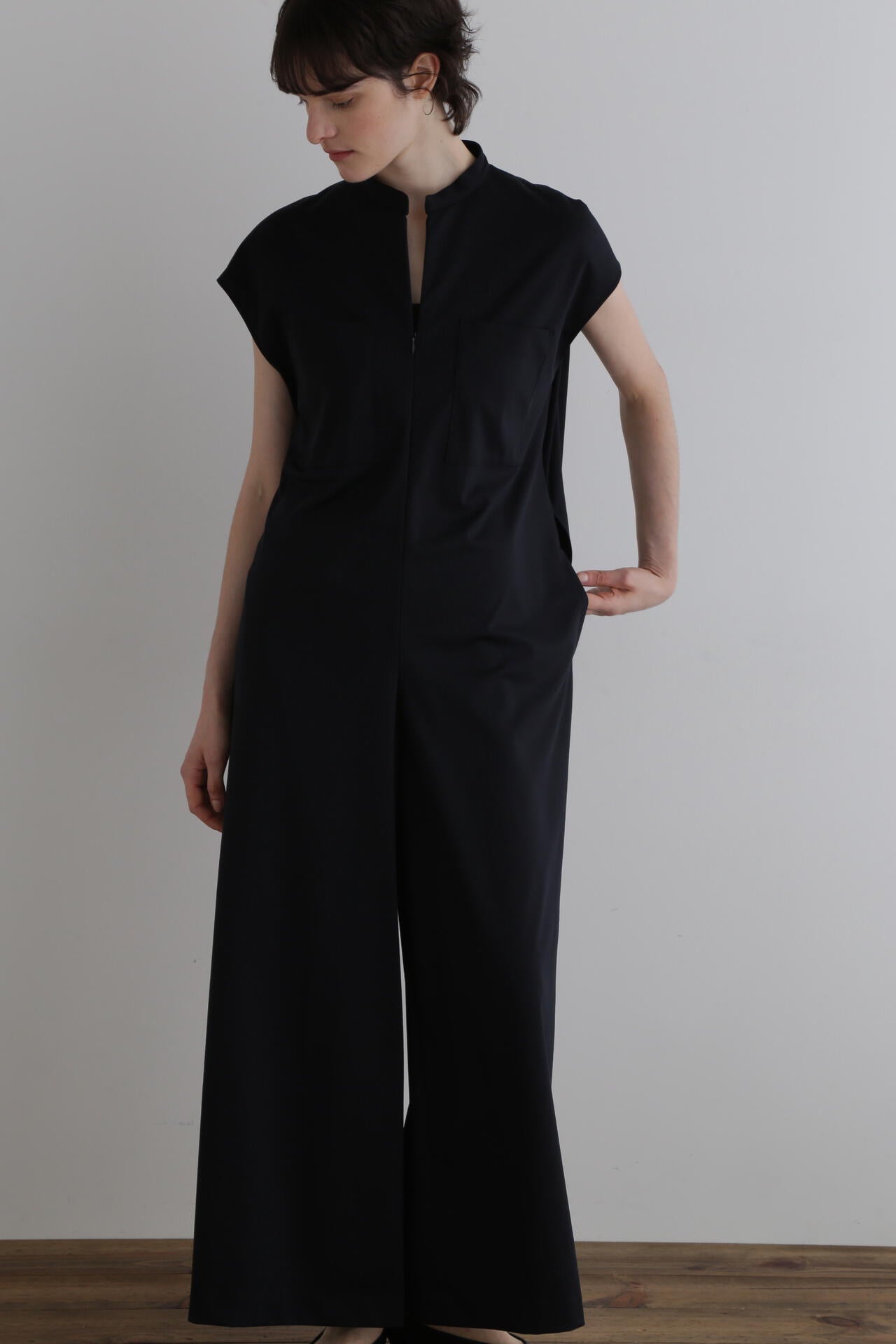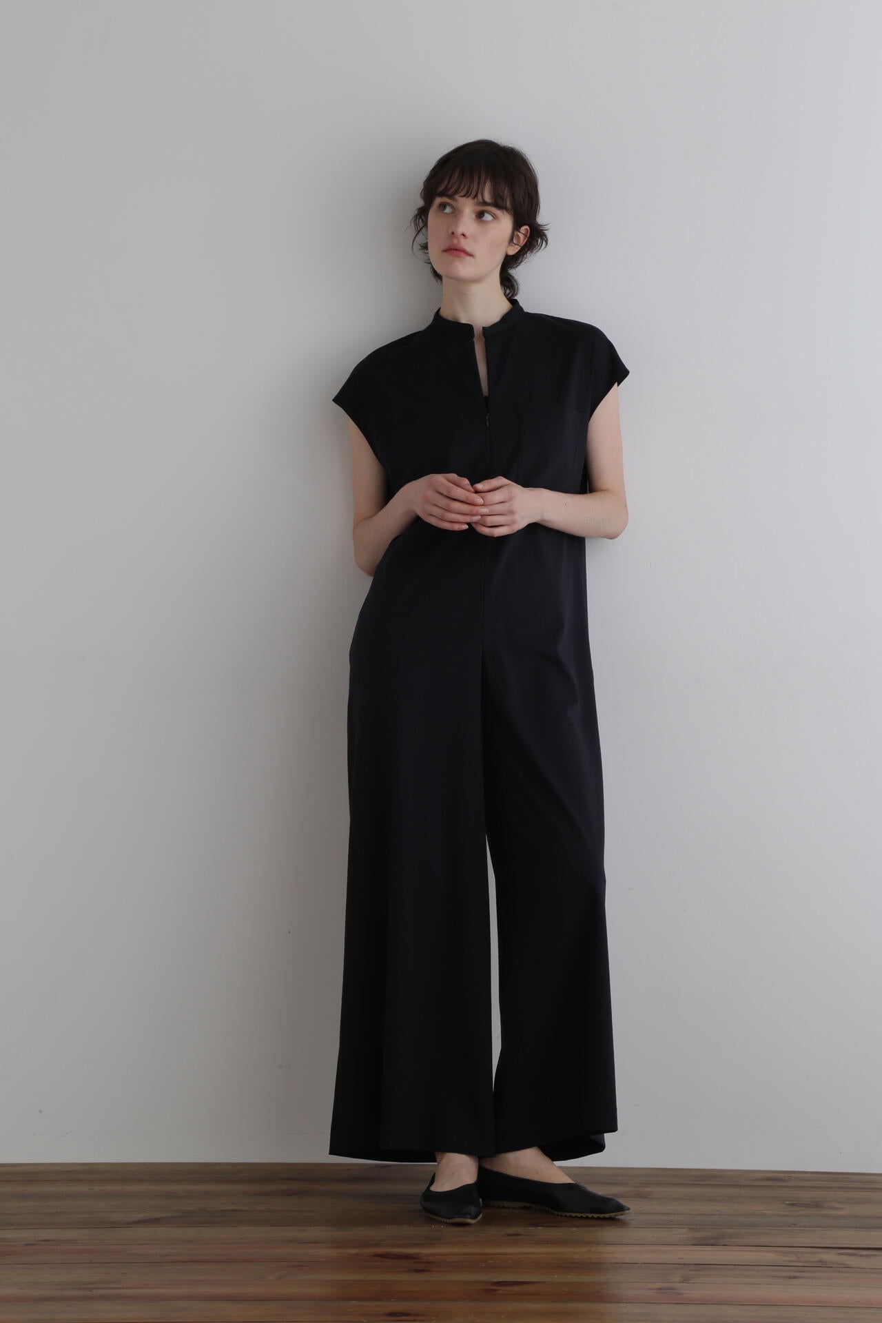 スタンドカラーネックのシャツトップに、ゆったりとしたフルレングスのワイドパンツがコンビになったオールインワンです。
