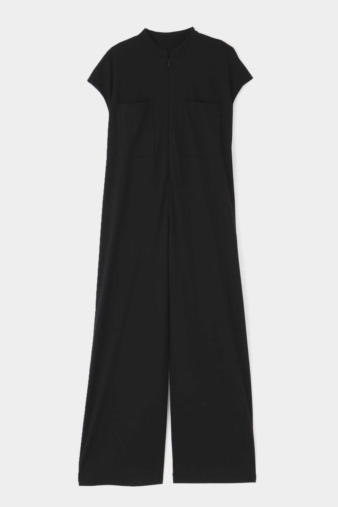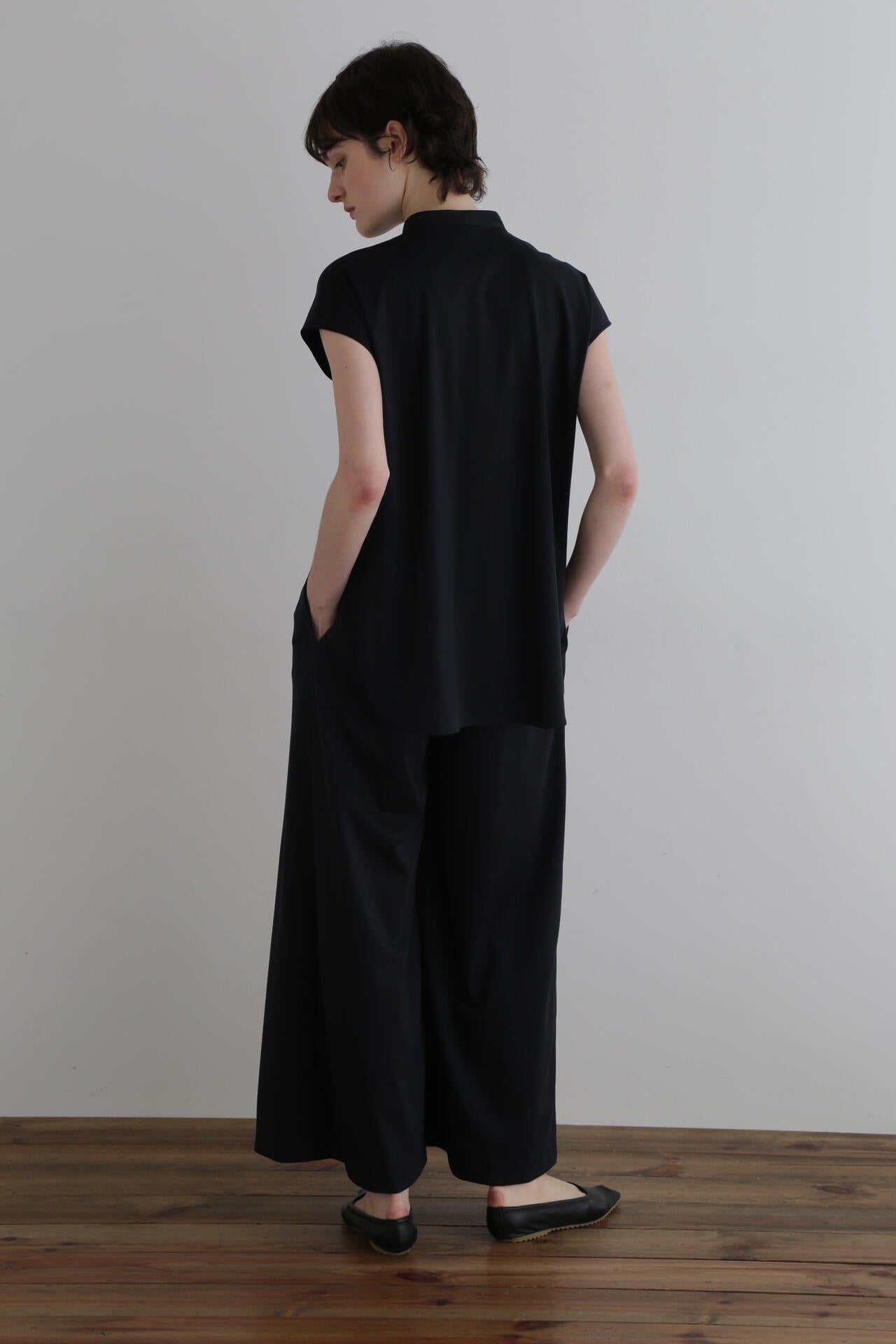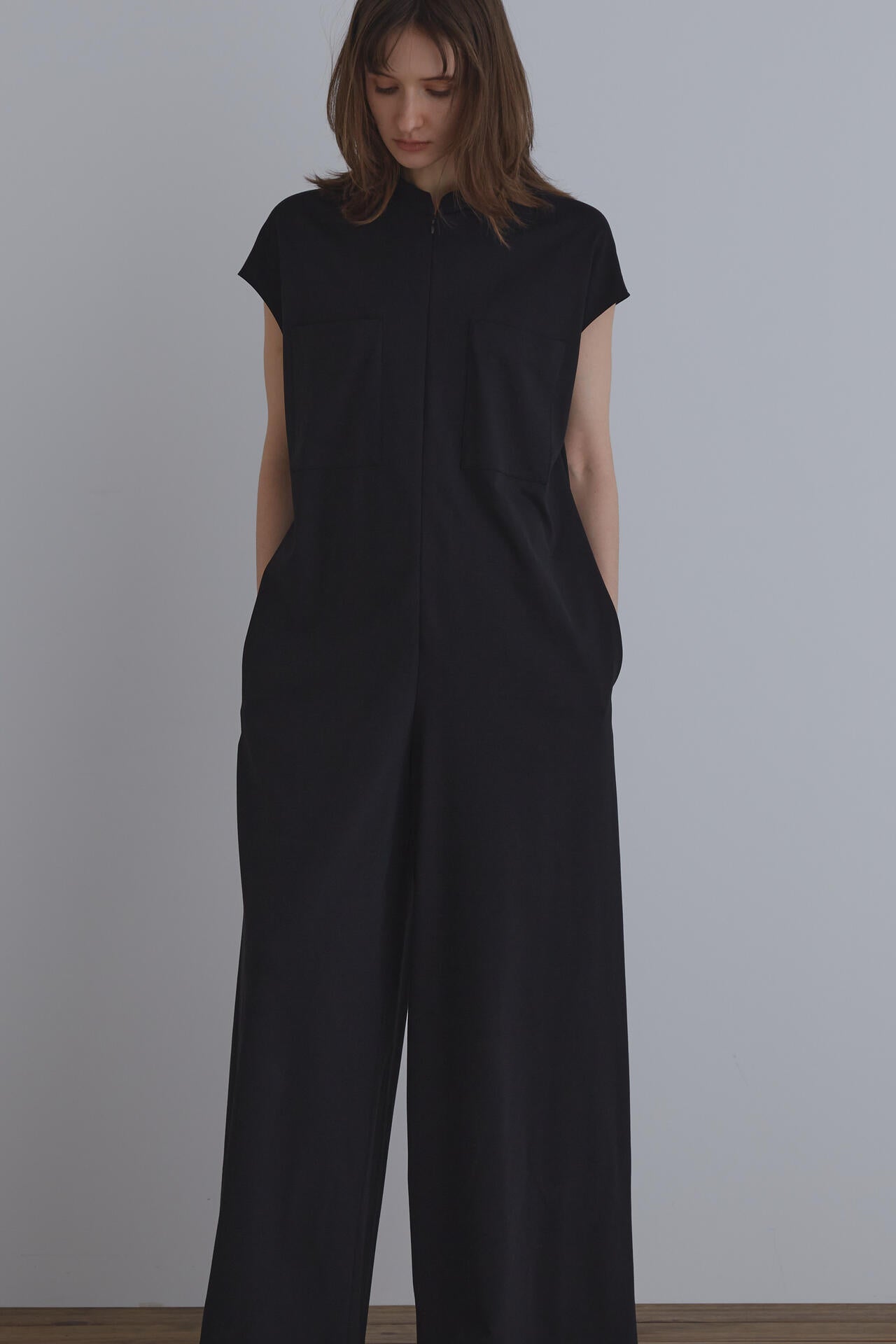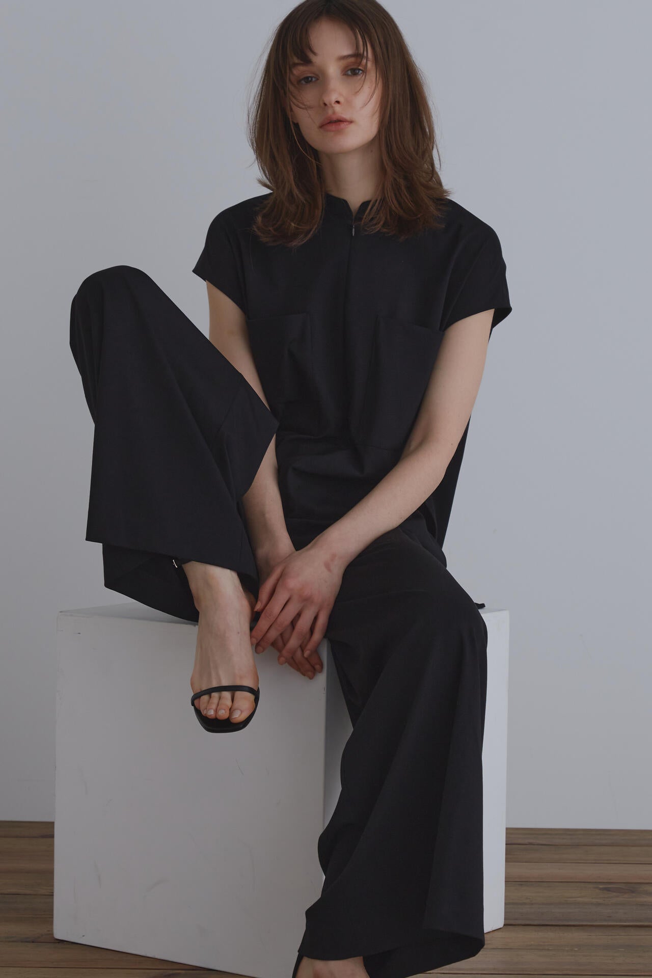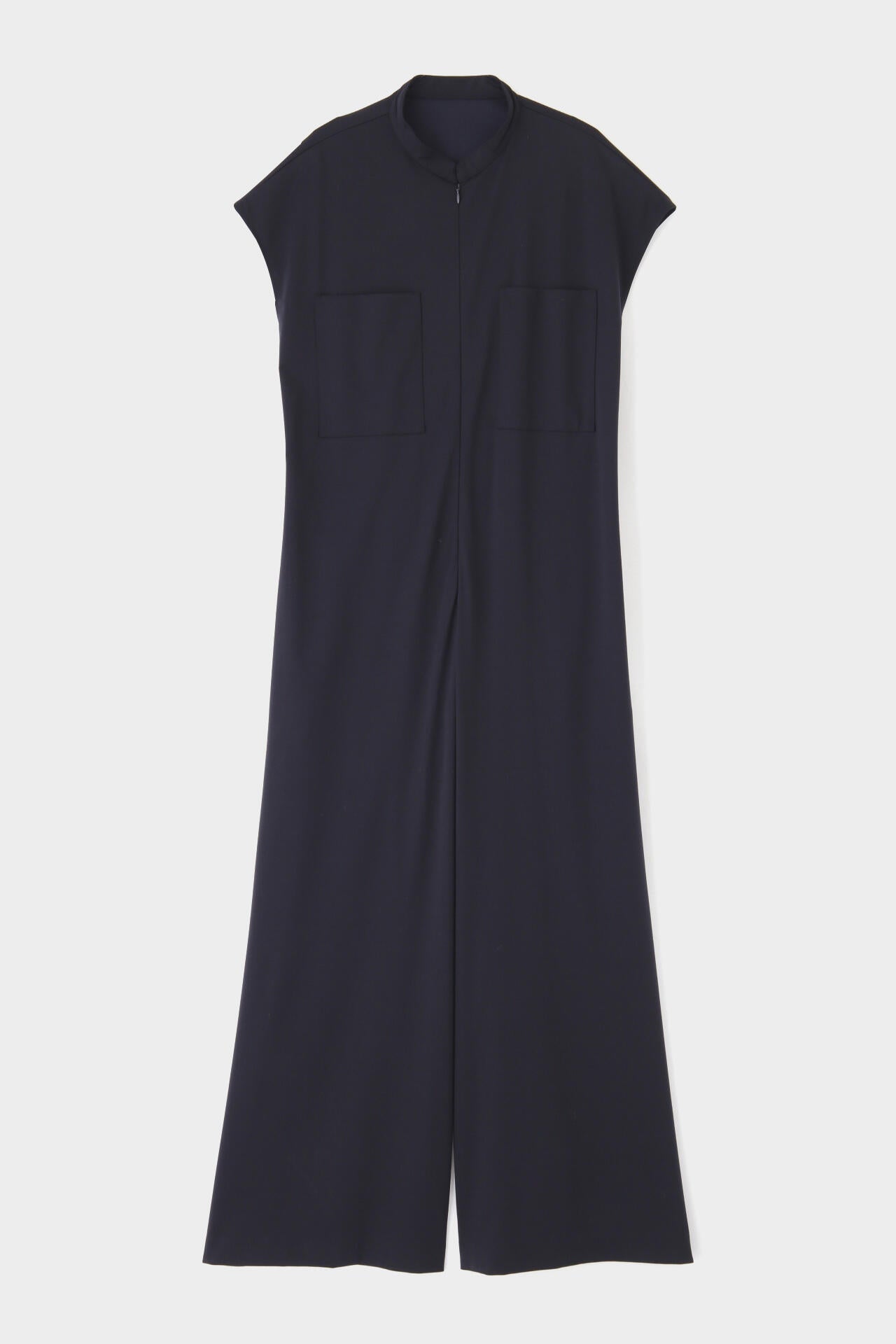 スタンドカラーネックのシャツトップに、ゆったりとしたフルレングスのワイドパンツがコンビになったオールインワンです。