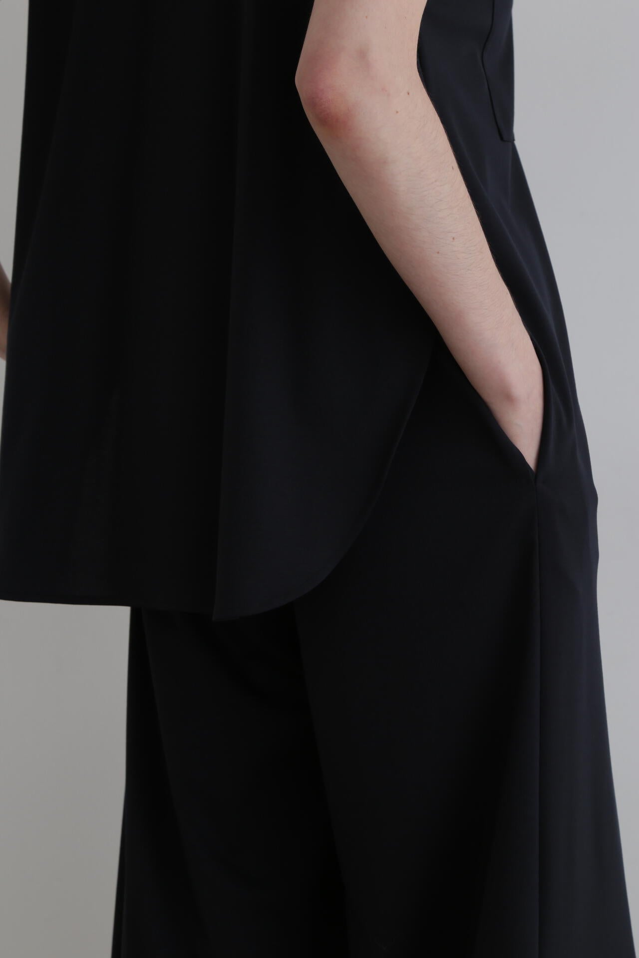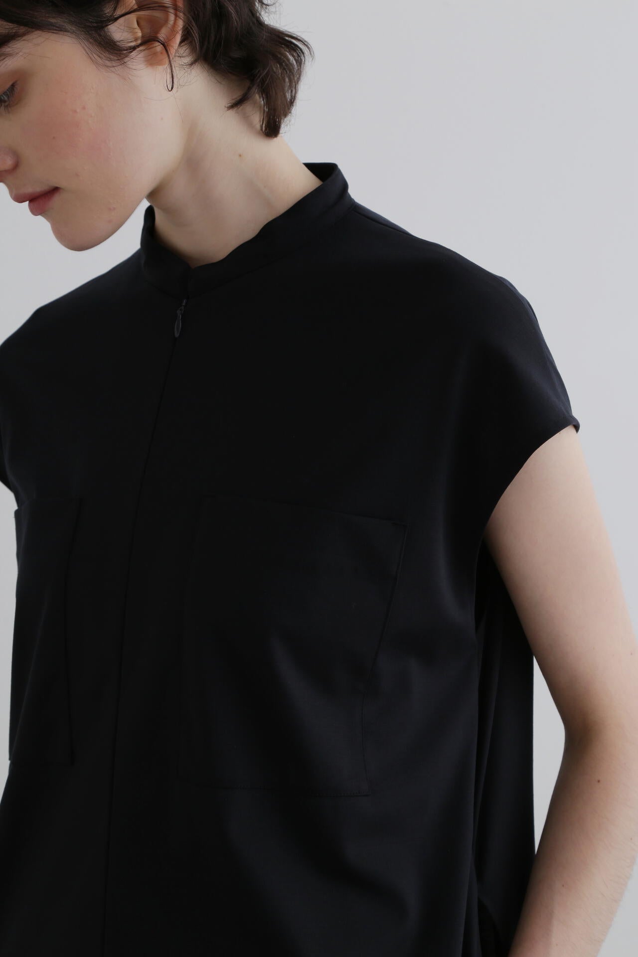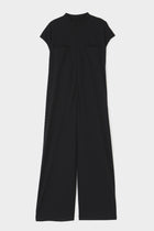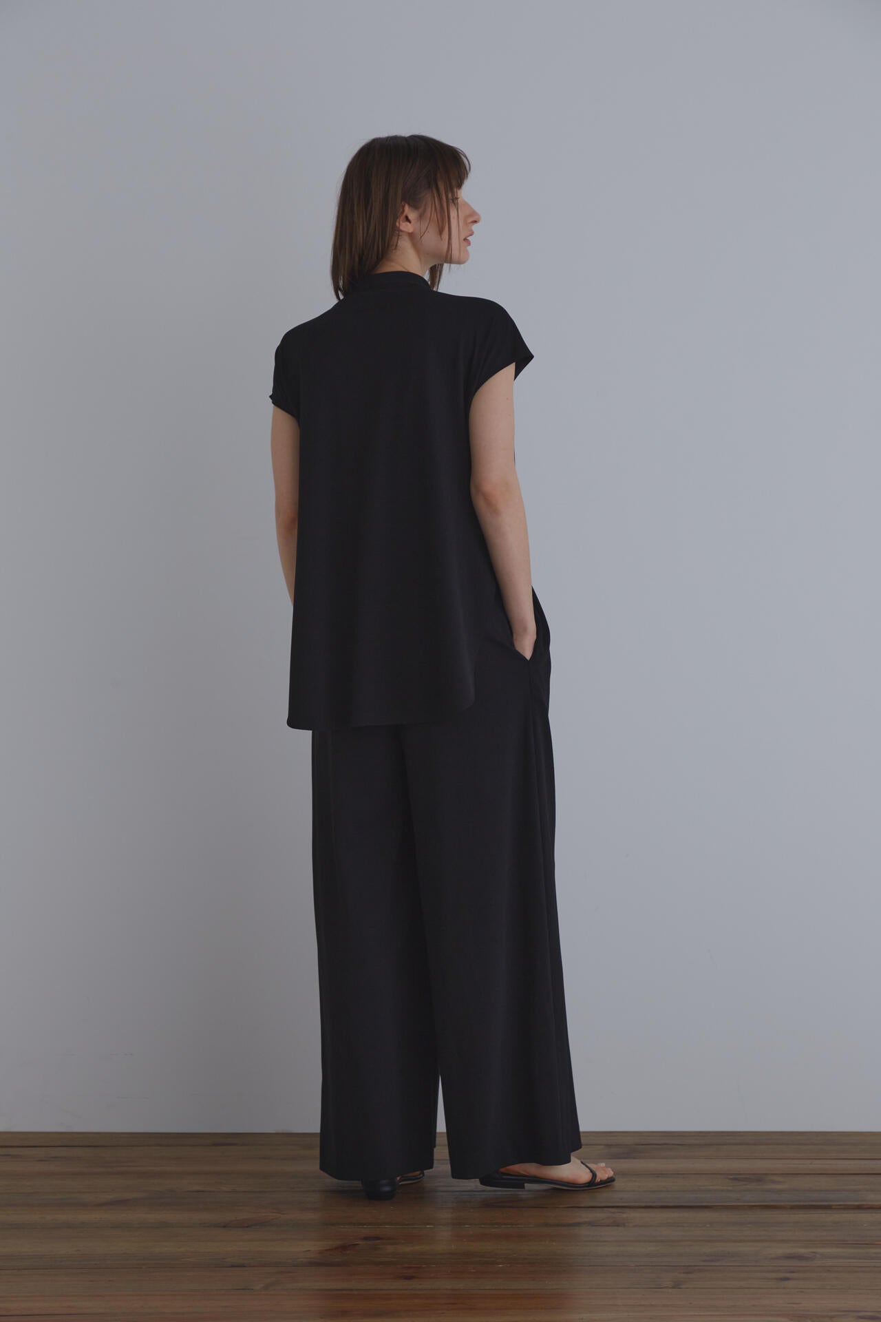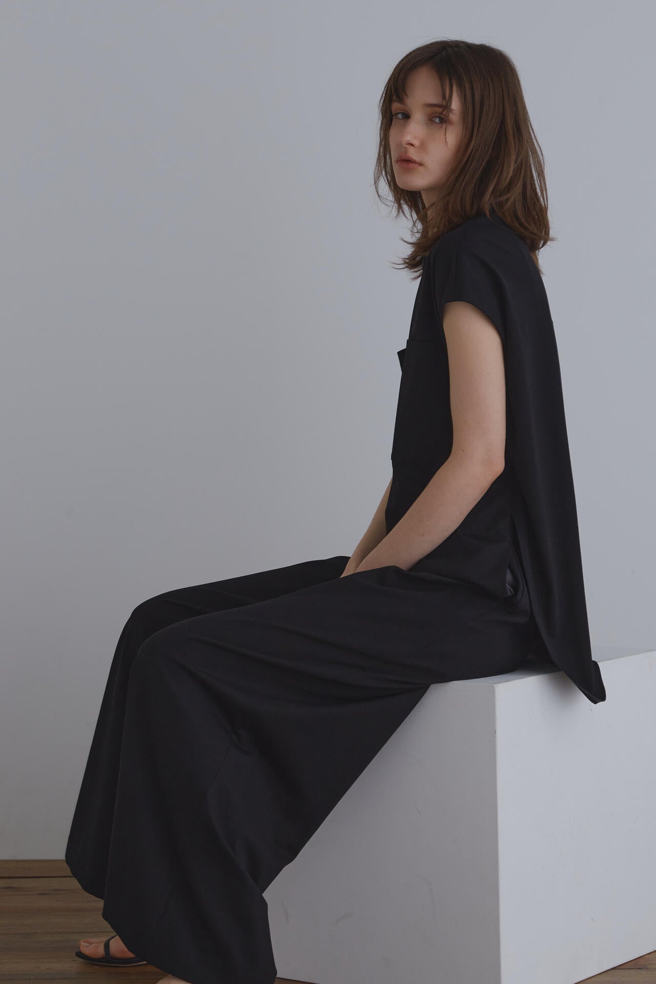 スタンドカラーネックのシャツトップに、ゆったりとしたフルレングスのワイドパンツがコンビになったオールインワンです。