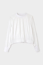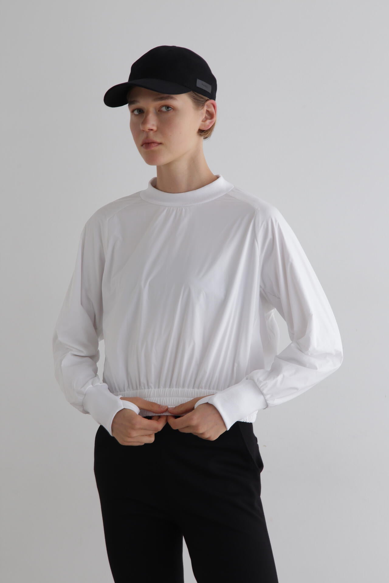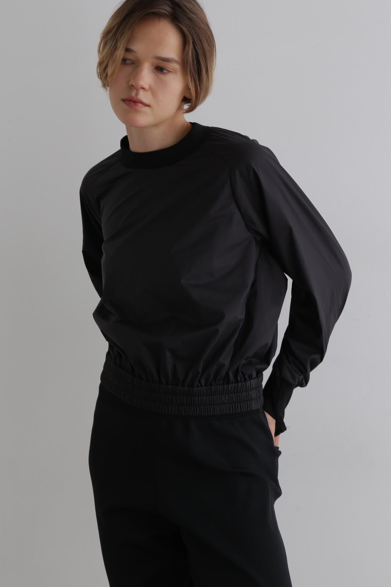 袖口のリブが長めで、指ぬき仕様を入れているのもポイントです。裾は一周ゴムギャザーでイージーに作っています。