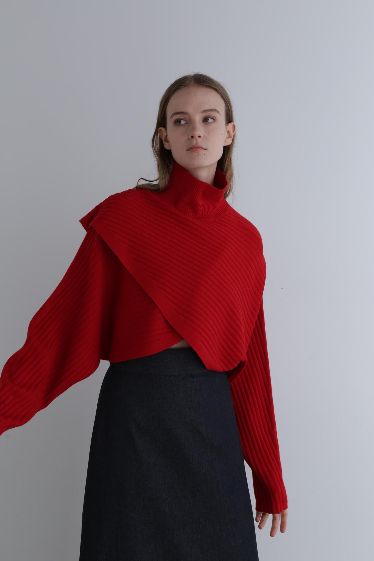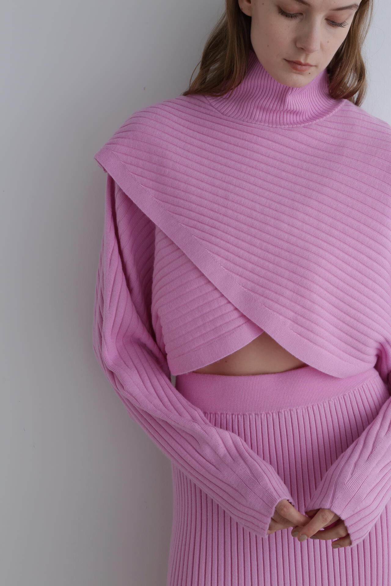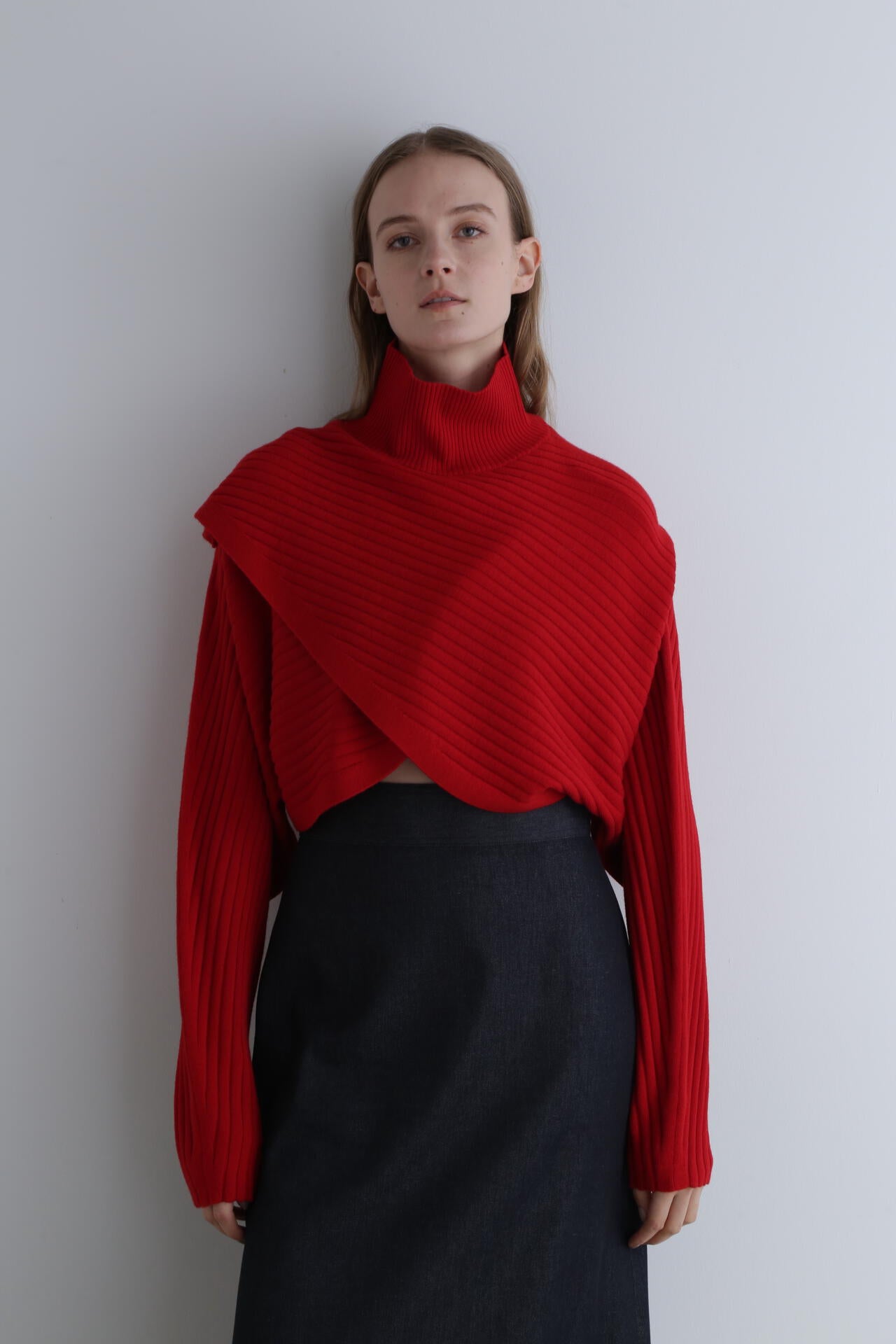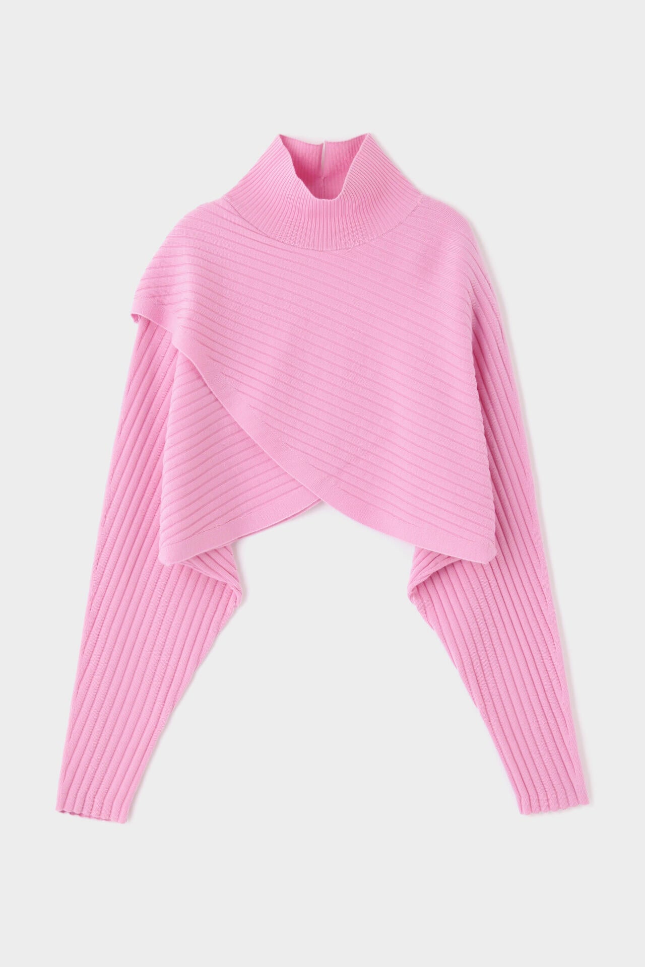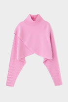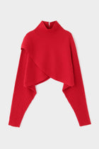 重なったデザインが特徴のワイドリブのショートニットトップスです。