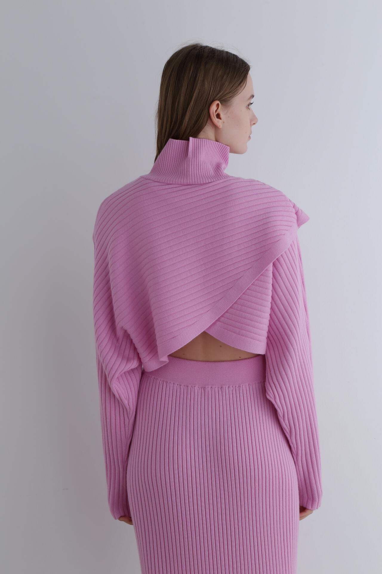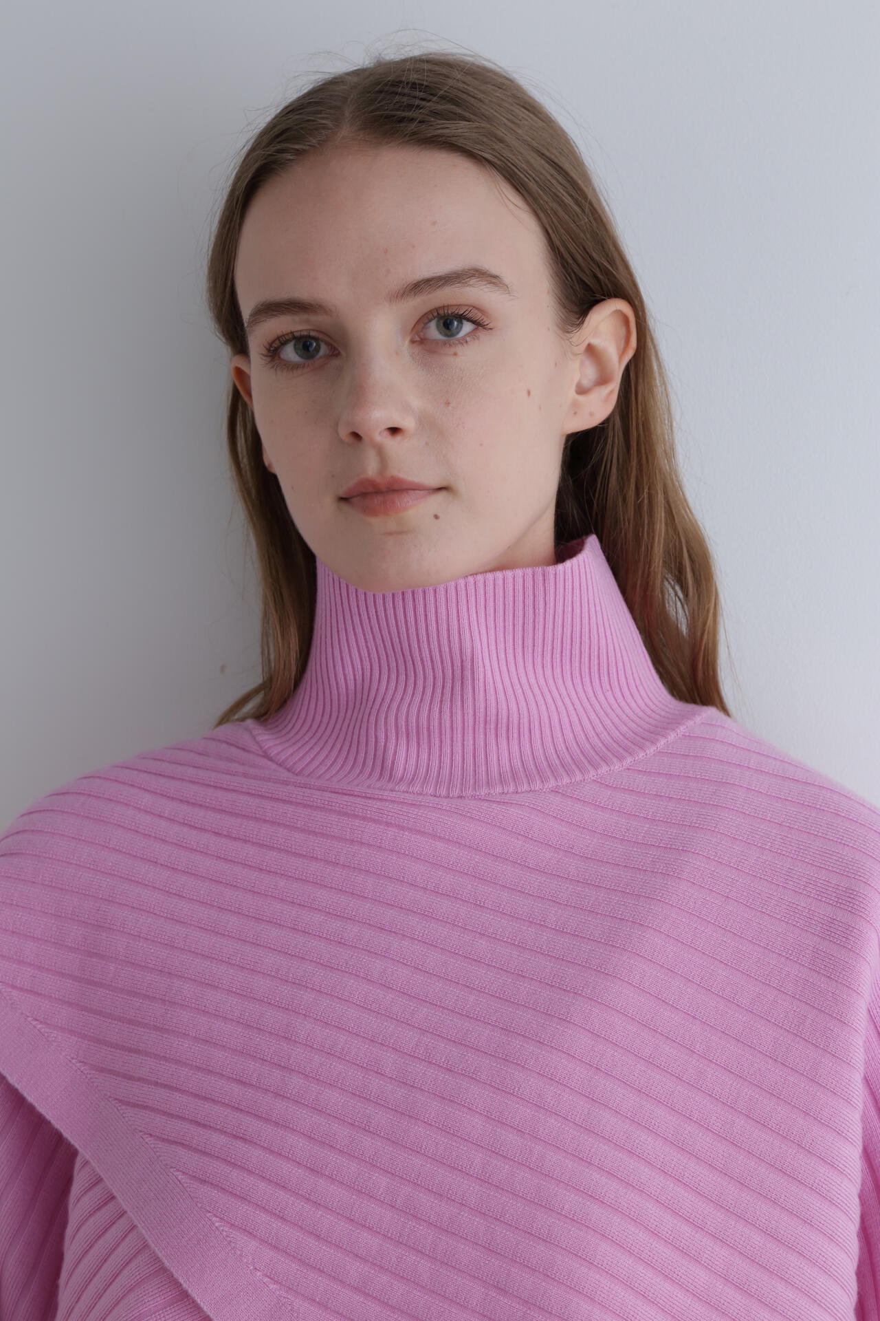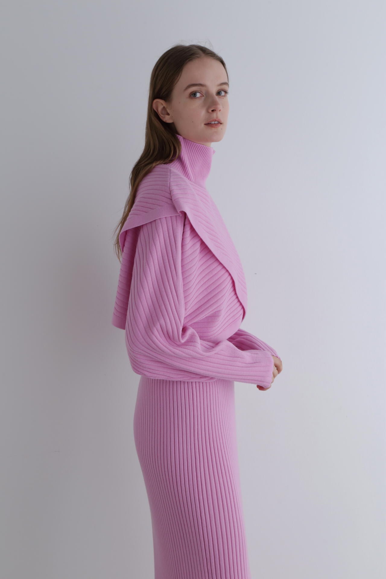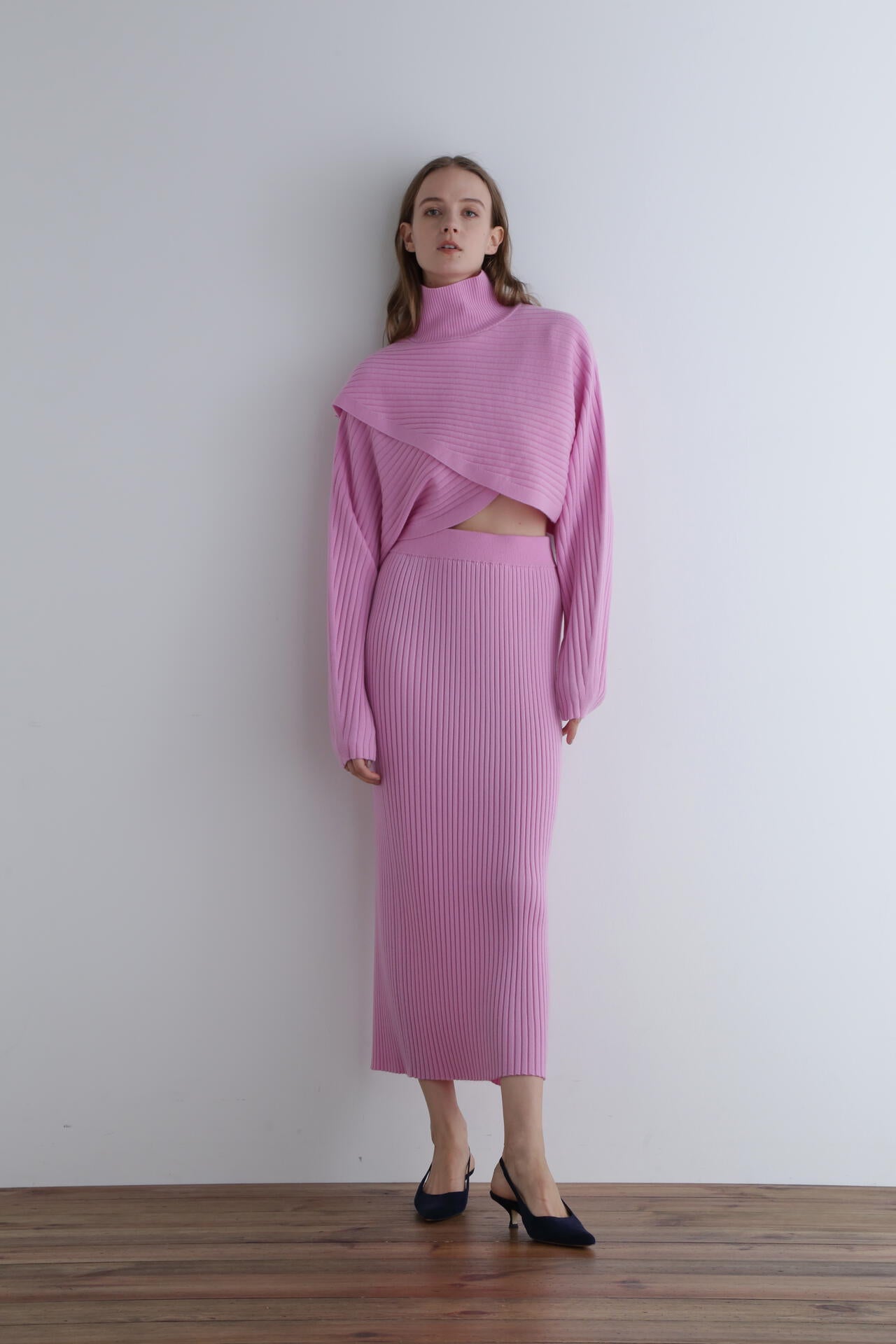 重なったデザインが特徴のワイドリブのショートニットトップスです。