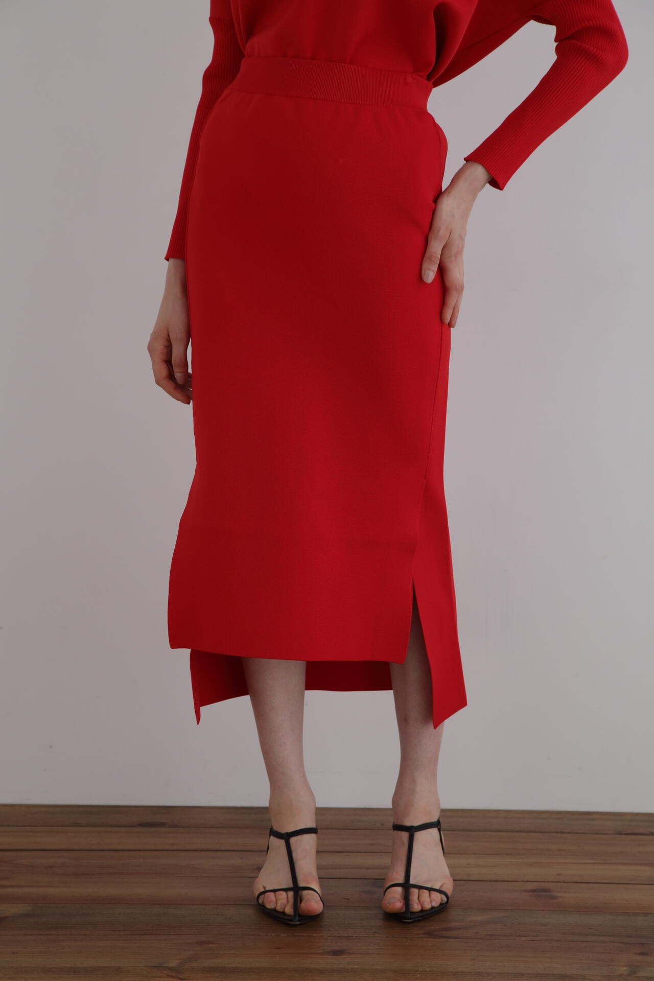 両サイドに入った深めのスリットと前後差のあるシルエットがポイントのニットスカート。
