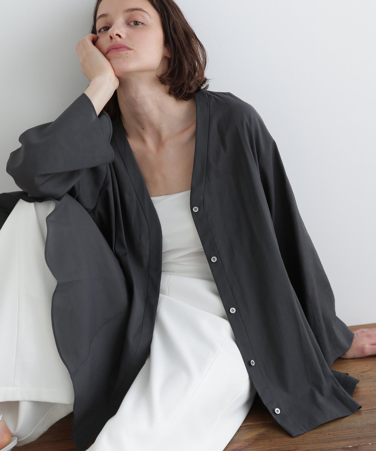 トリアセ混の清涼感のあるシャツ素材を使用したフレアーブラウス。