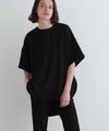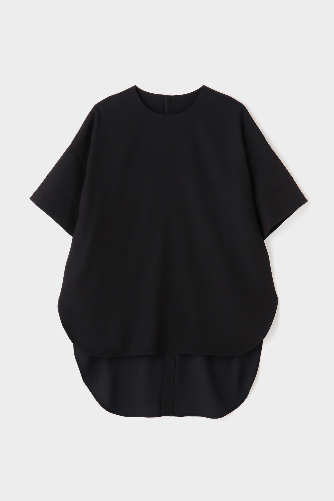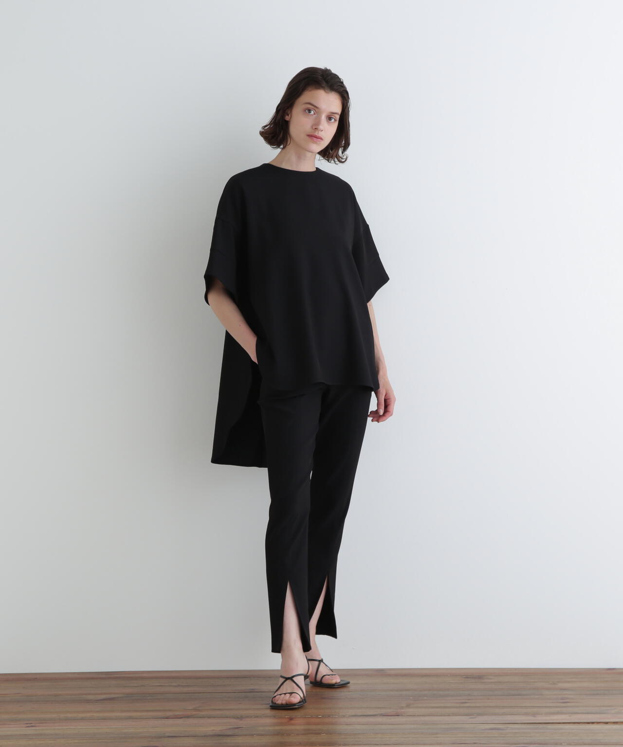 程よい厚みで身体のラインを拾いづらく、ジャージーのようなソフトな肌触りとストレッチ性が特徴の二重織素材です。