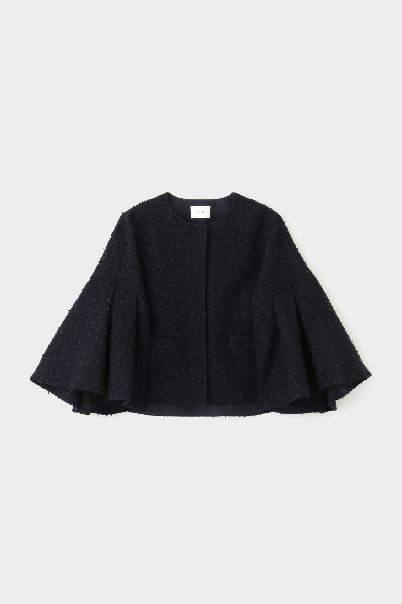 上品だけどミセスすぎない、シックなツイード素材を使用したフレアスリーブのジャケット。