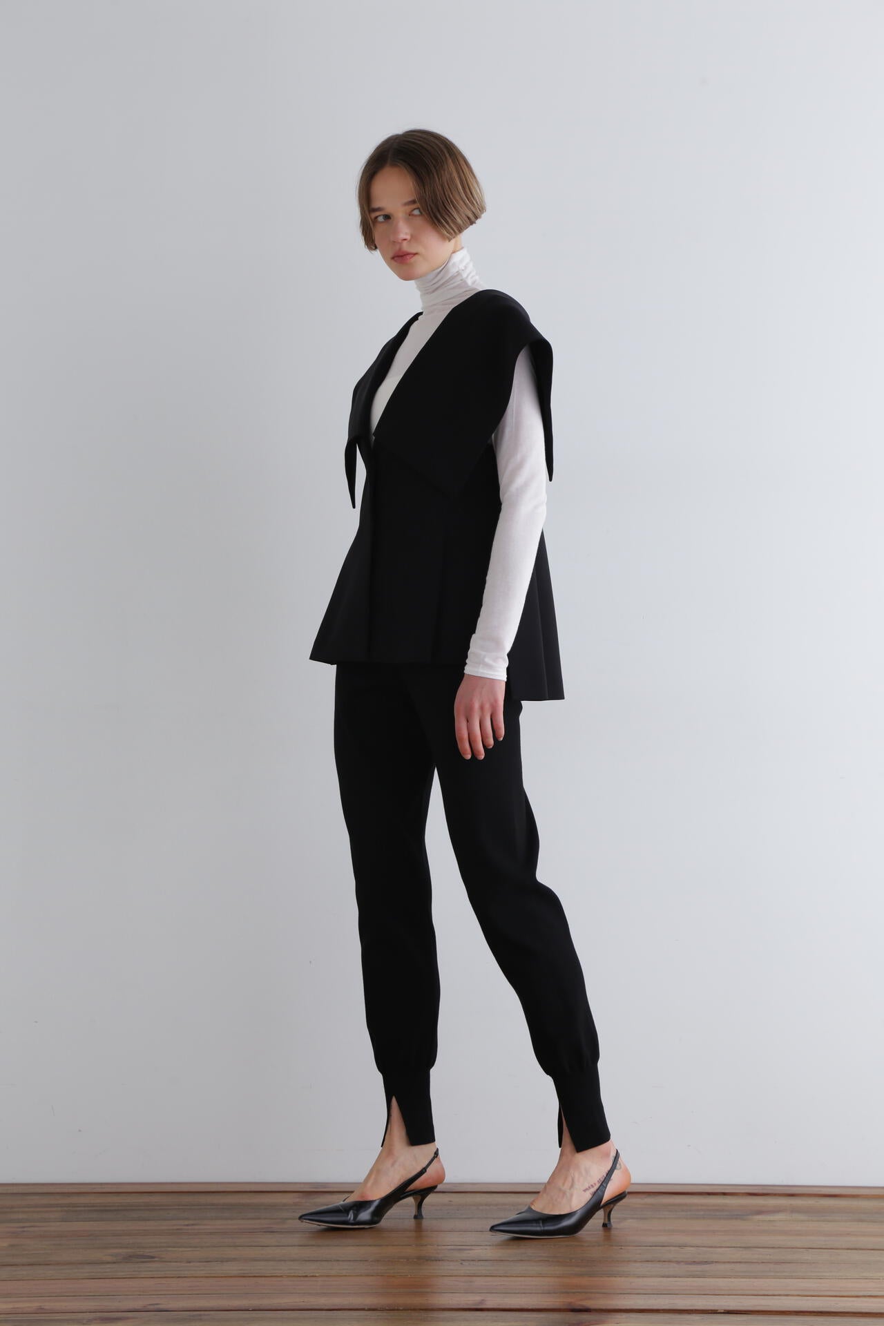 ボトムスのシルエットを選ばない着丈感、幅広いコーディネートにお楽しみいただけるジレです。