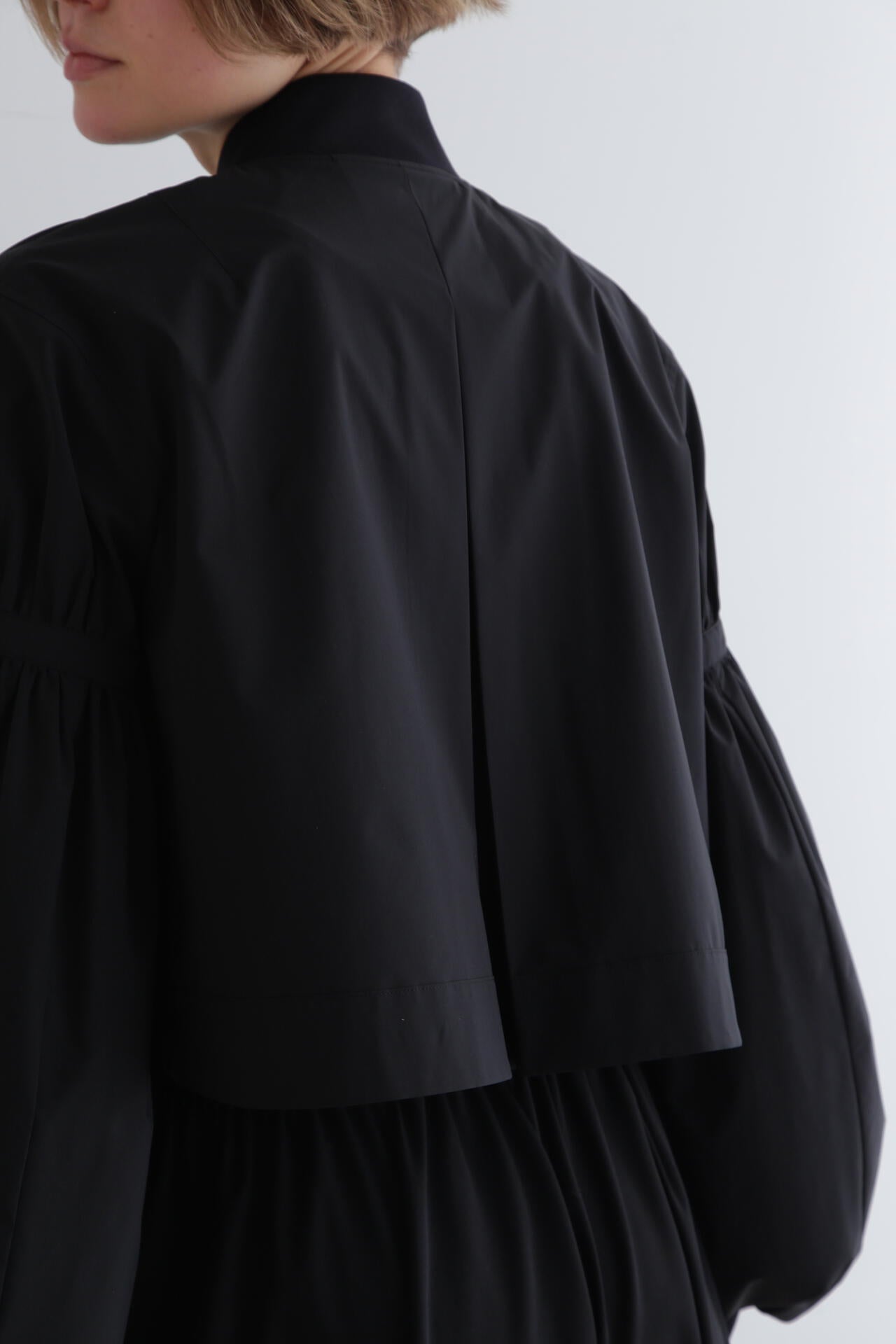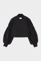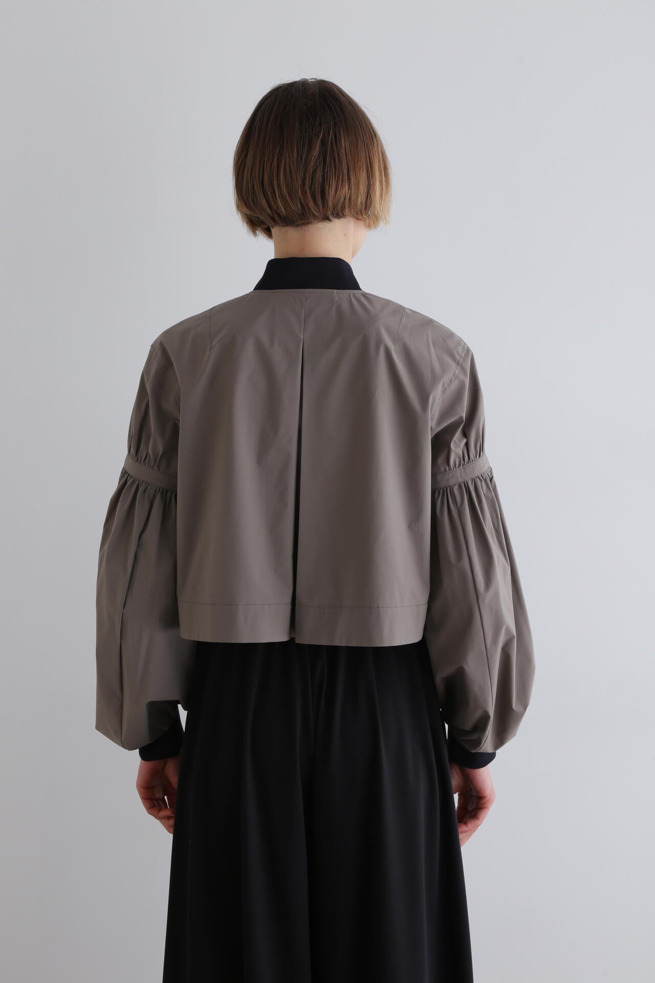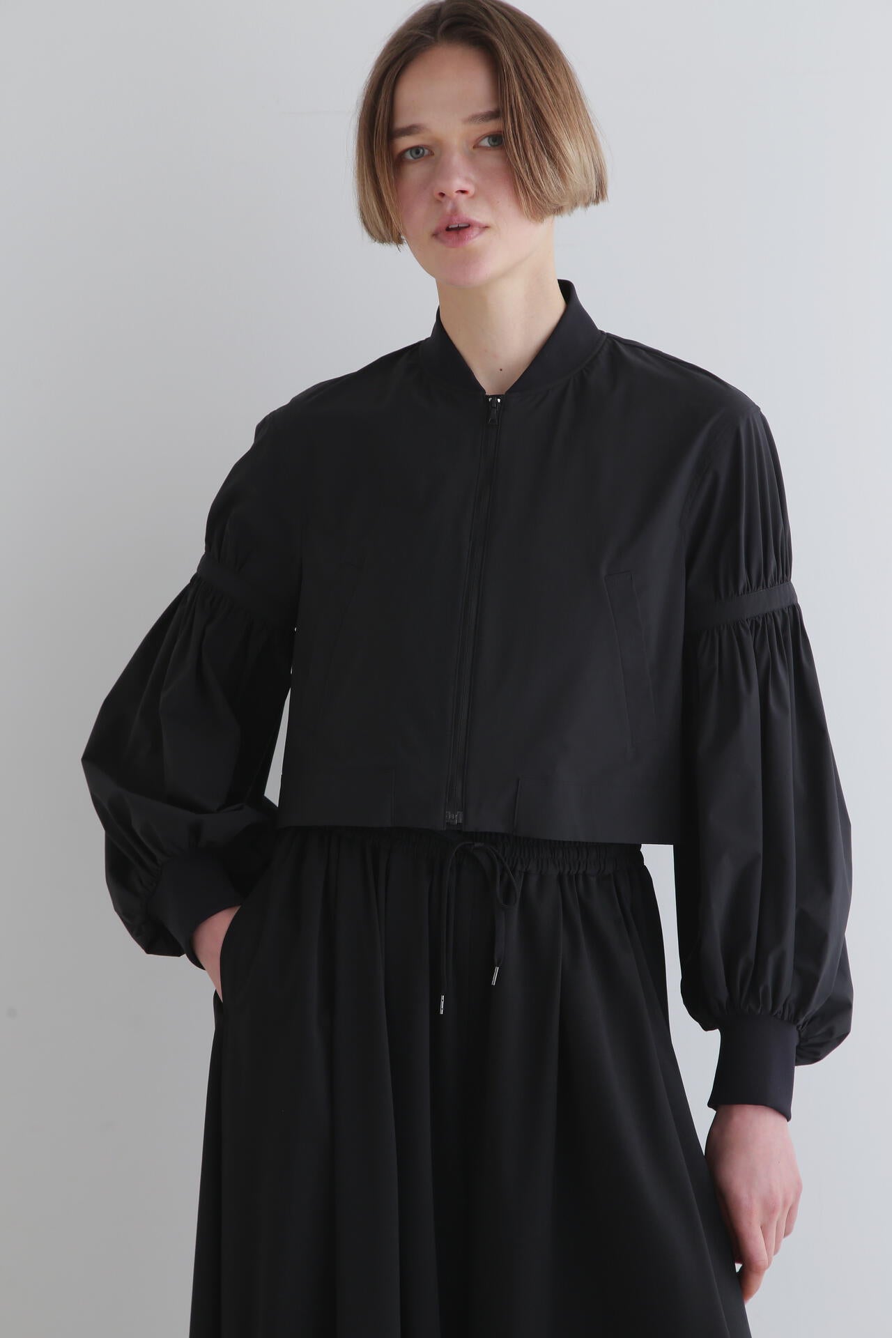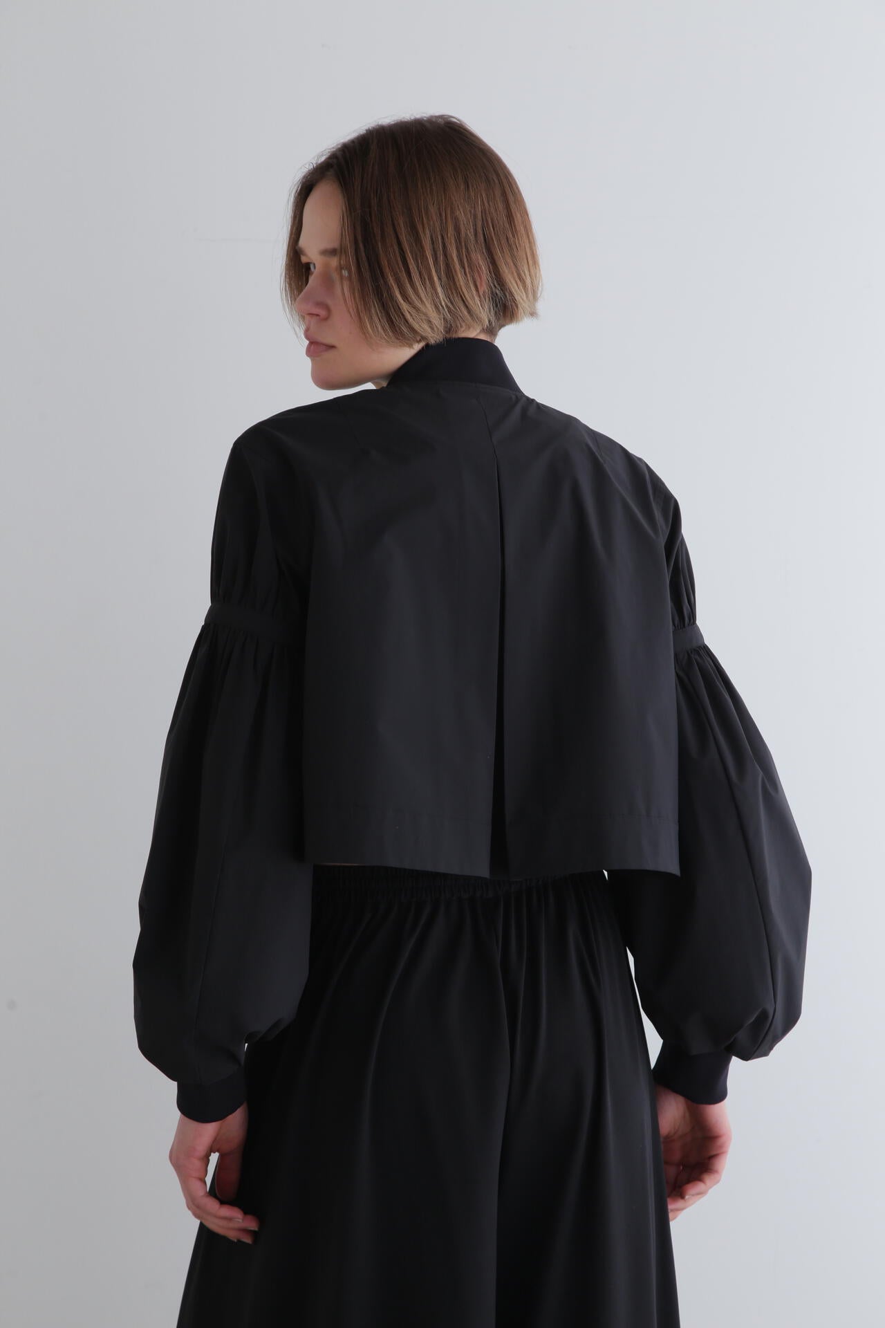 ショート丈とワイドなパフスリーブのバランスが女性らしく、着こなしの鮮度をぐっと格上げ。