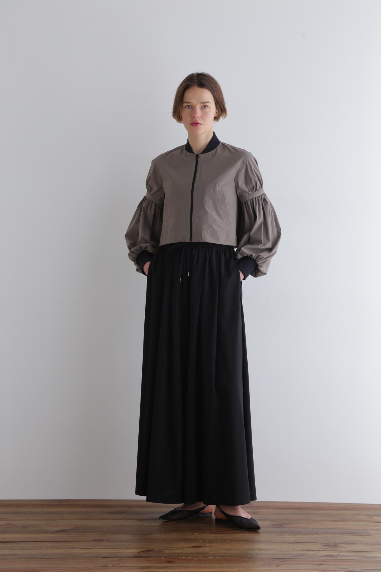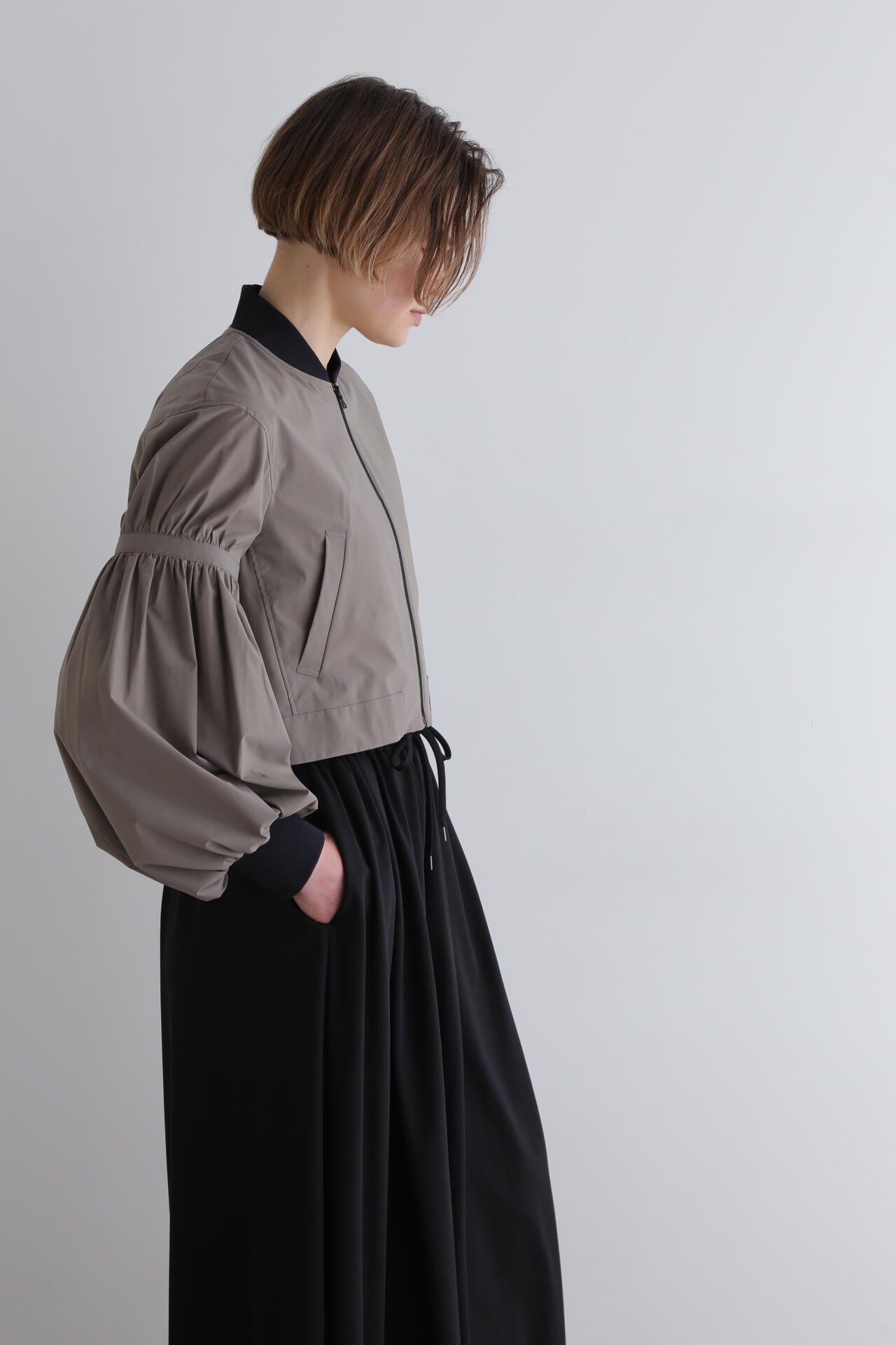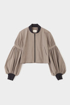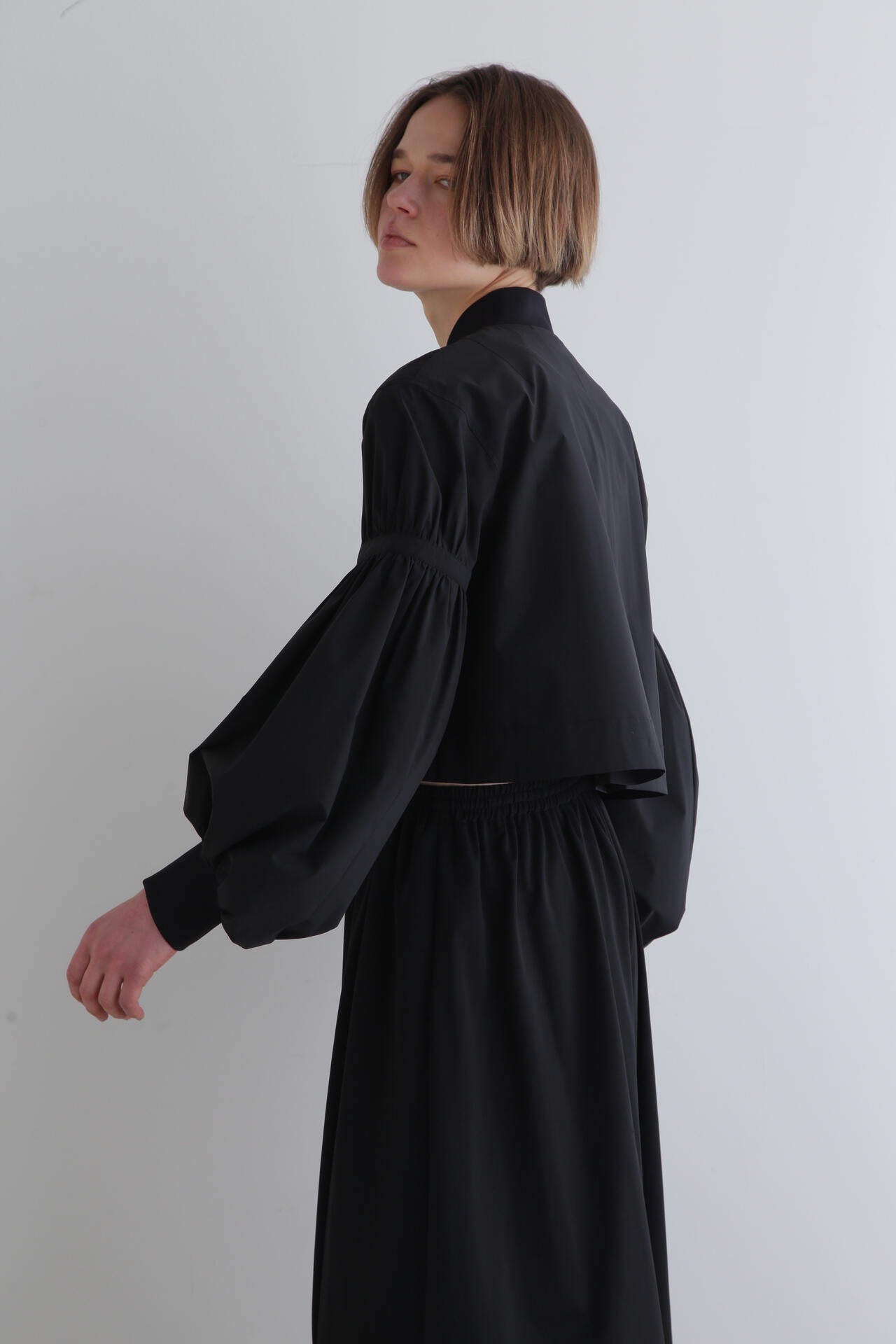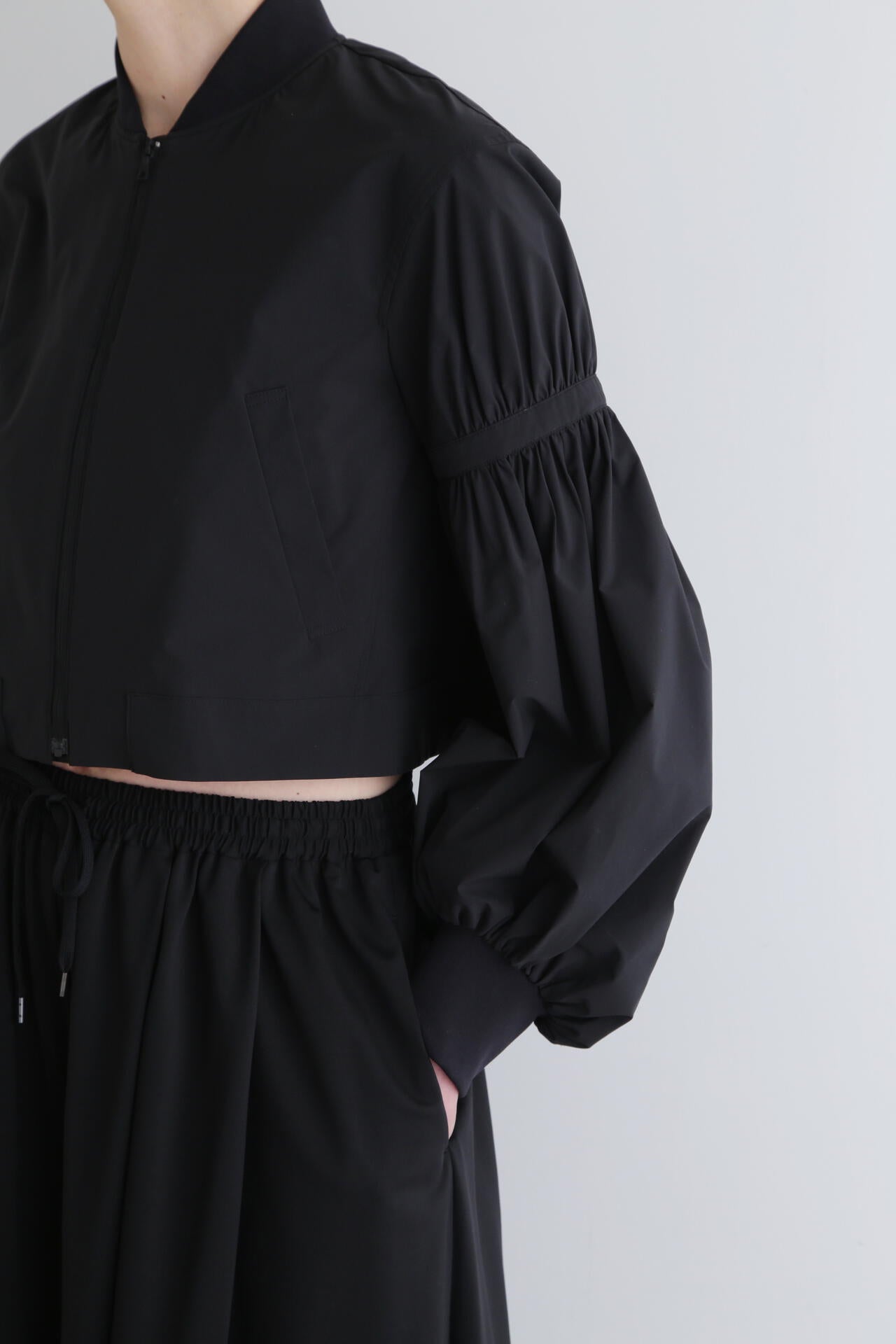 ショート丈とワイドなパフスリーブのバランスが女性らしく、着こなしの鮮度をぐっと格上げ。