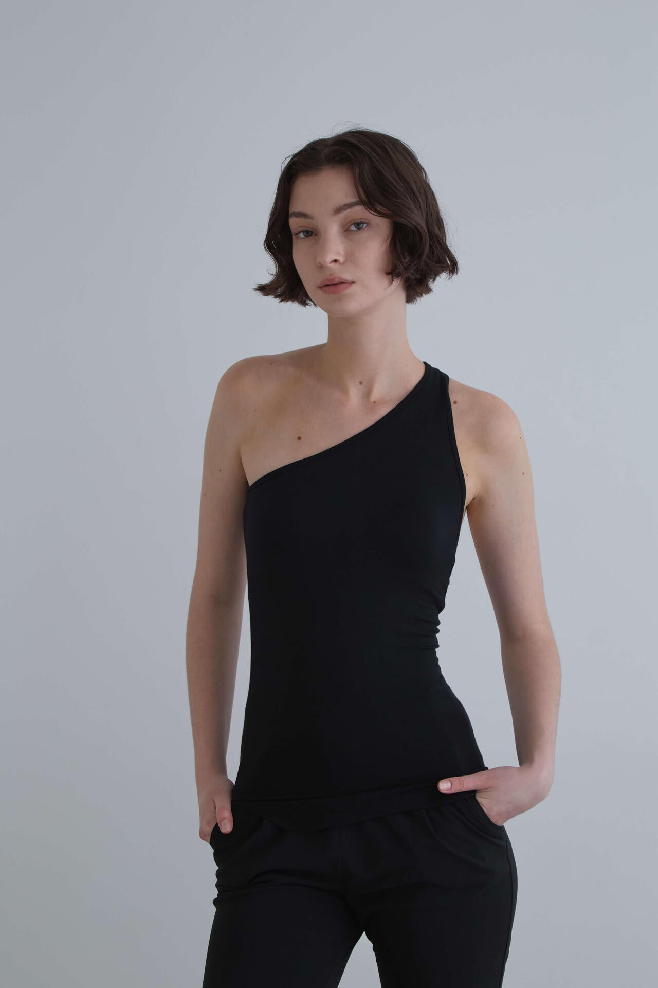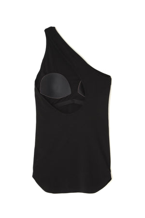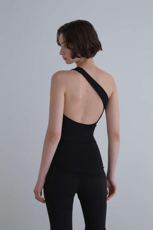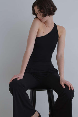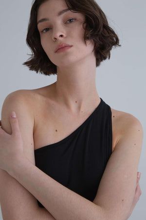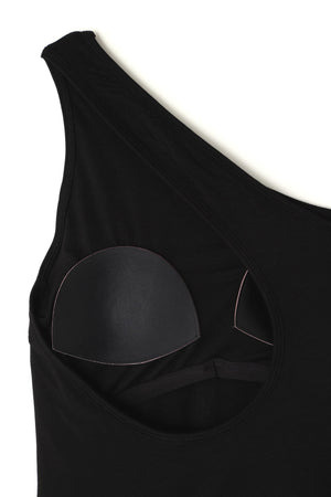 大胆なカッティングがポイントのワンショルダートップス。