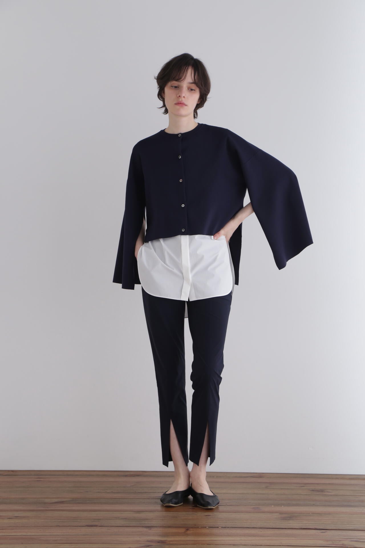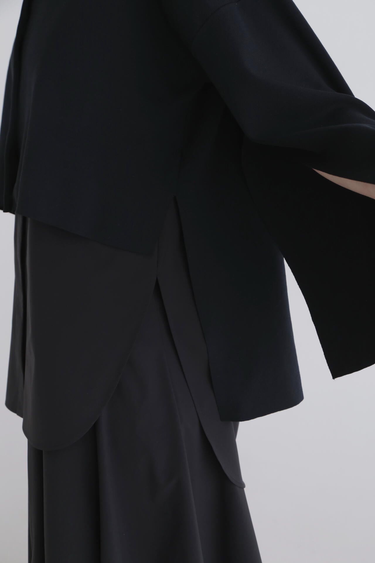 脇スリットや前後差を付けたヘムがコーディネートを軽やかに見せ、アクセントをプラスしてくれます。