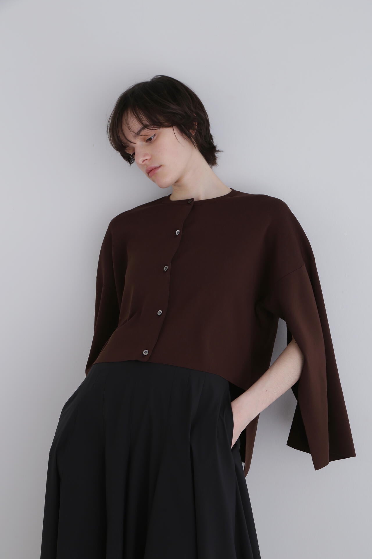 スリットスリーブがポイントのデザインカーディガン。