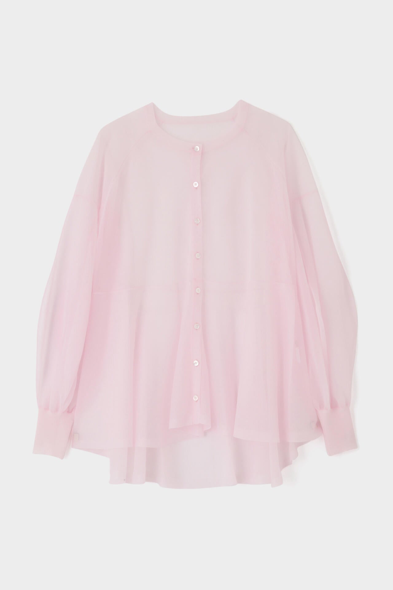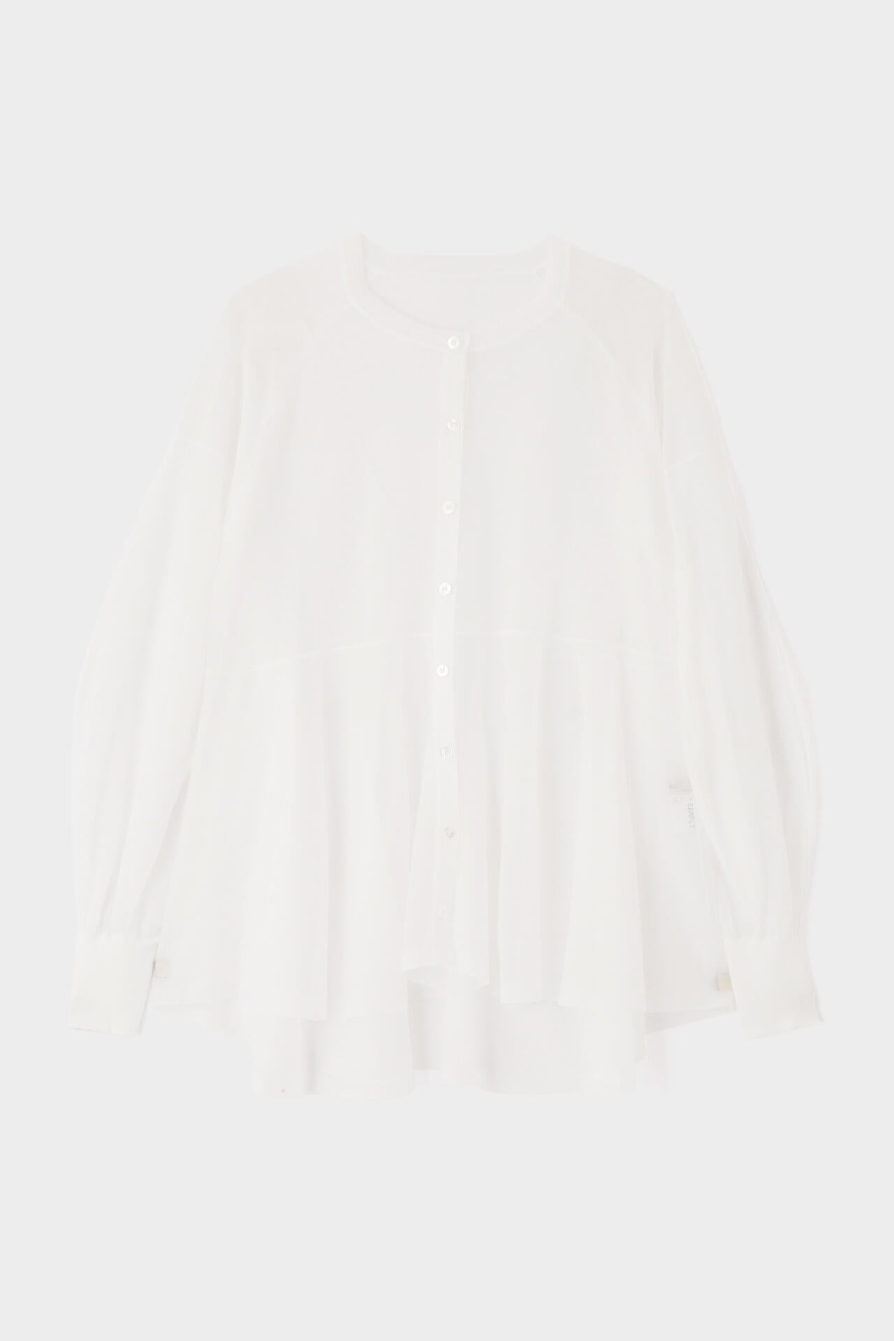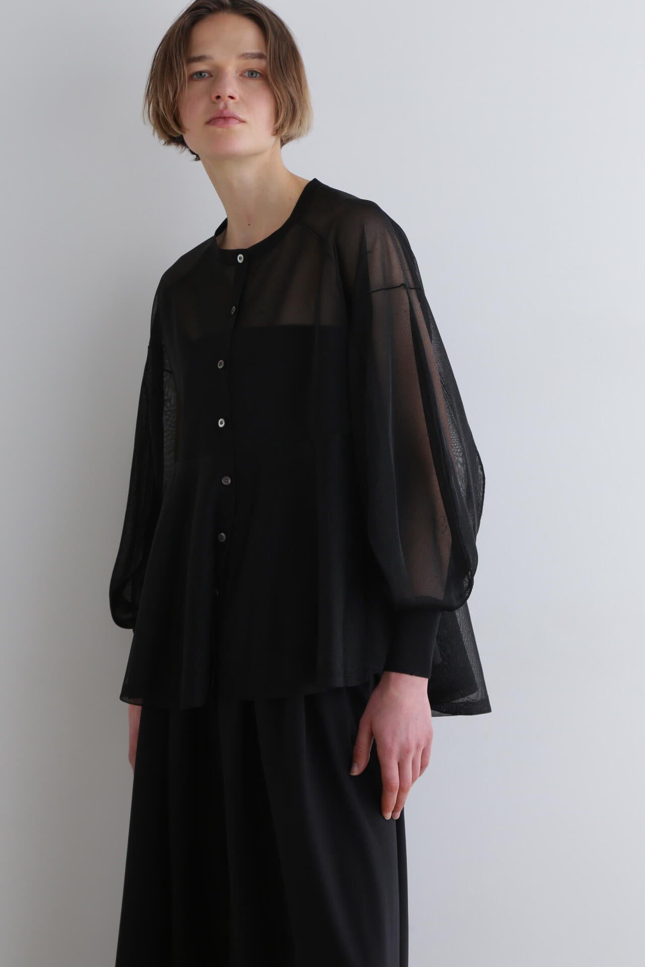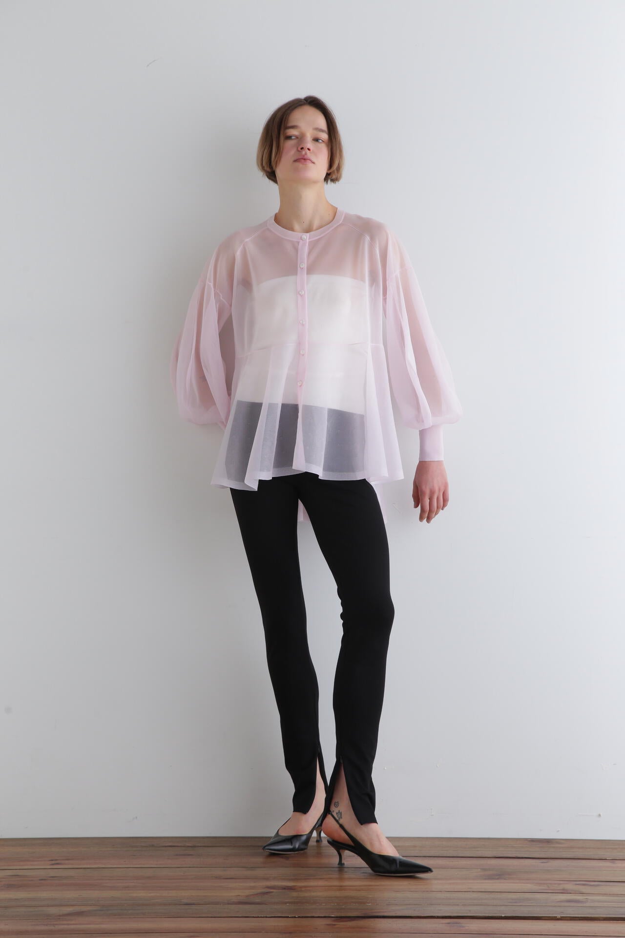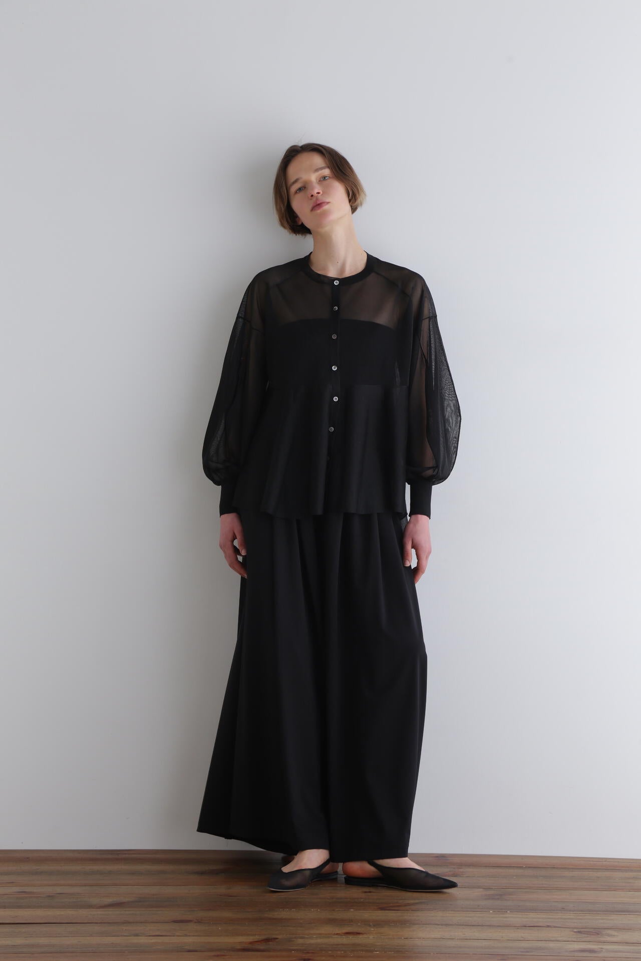 まるで布帛のブラウスのように袖をふくらませ、ウエスト切り替え下にはフレアーを出すことで立体感を出しました。