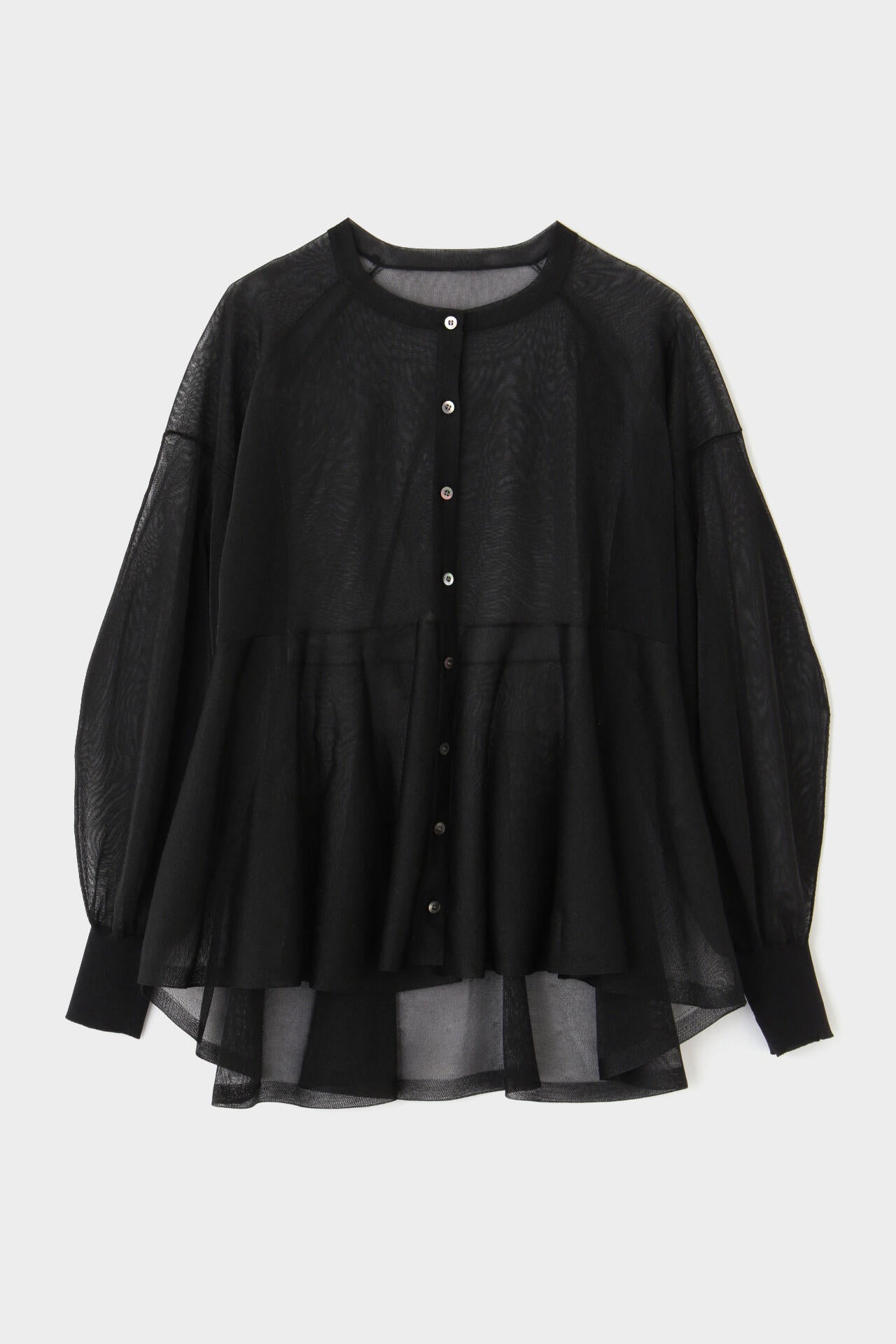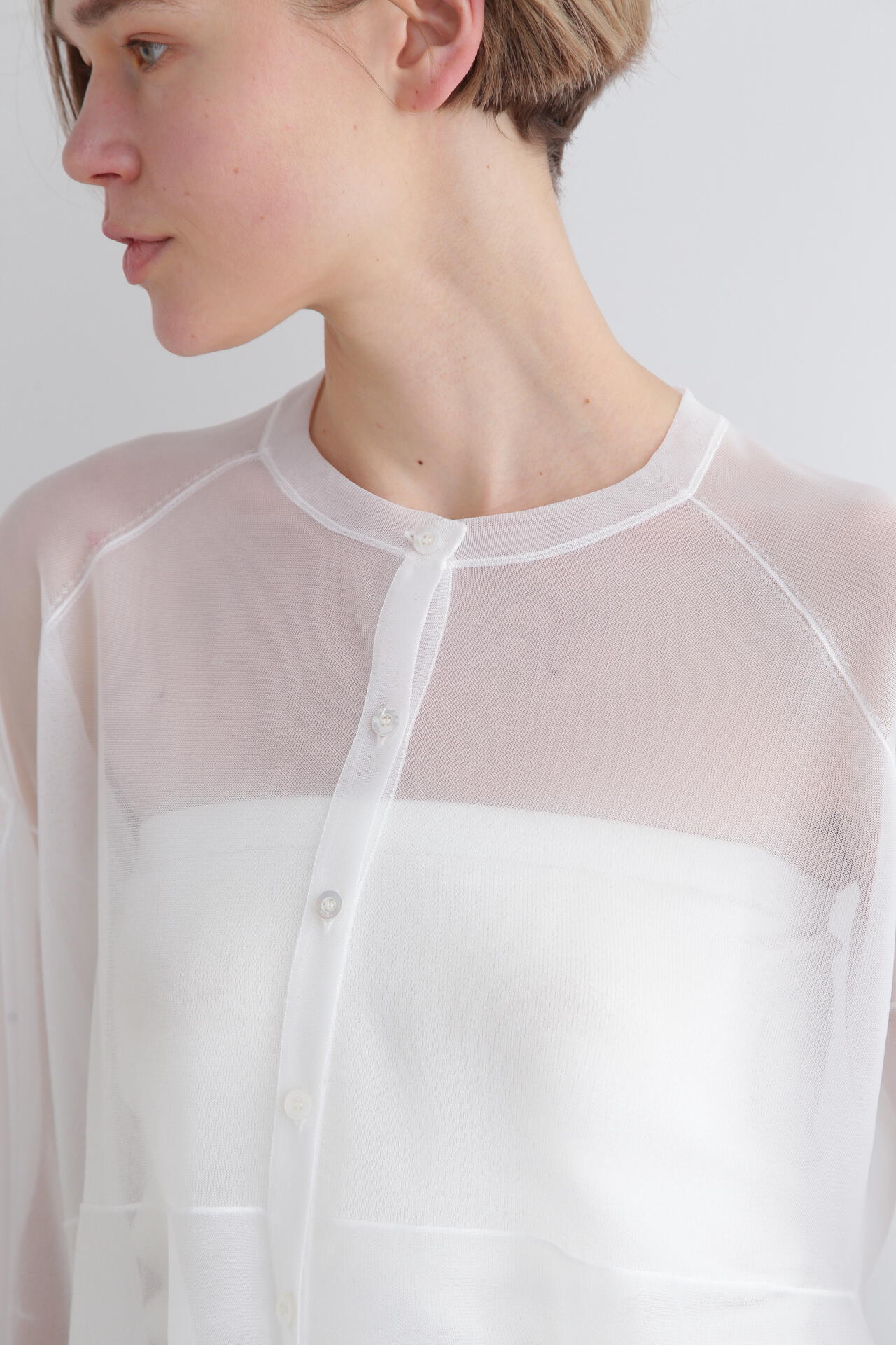 オーガンジーのようなハリ感がポイントの糸で編んだニットカーディガンです。