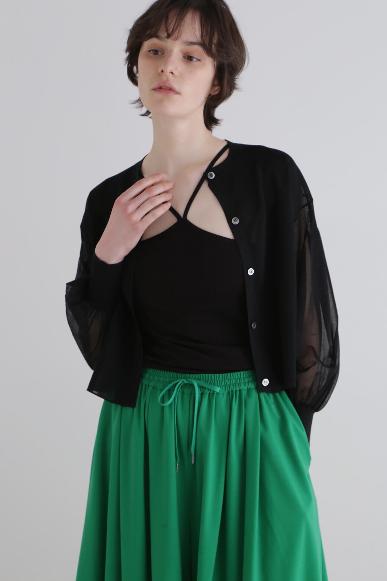 透け感がありながら、身頃だけミラノリブでしっかり編まれ、薄くないのに透けている鮮度のあるショートカーディガン。