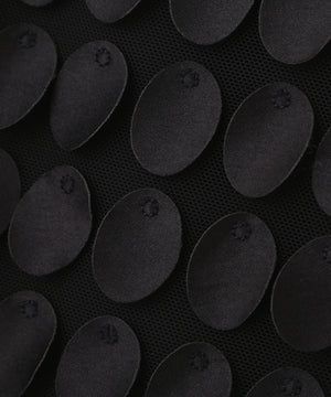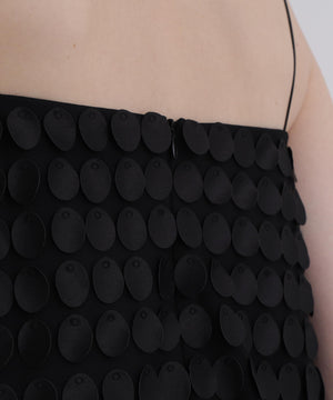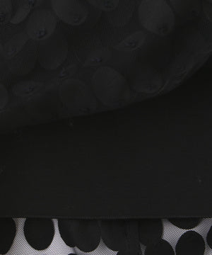 チュール素材にポリエステルサテン素材を刺繍した後に楕円形にレーザーカットで3Dにしています。