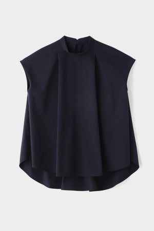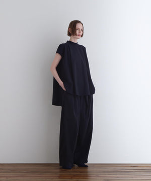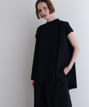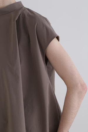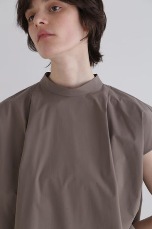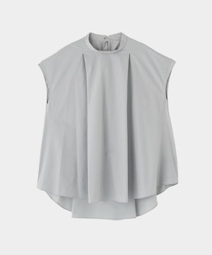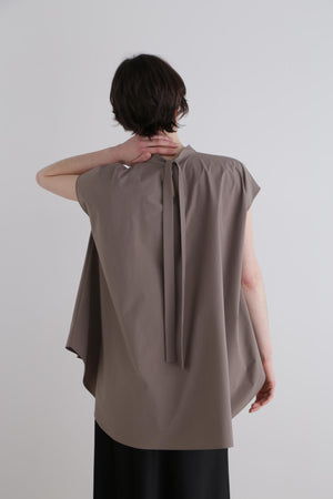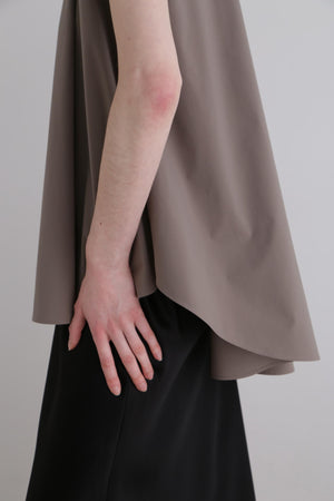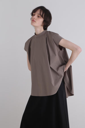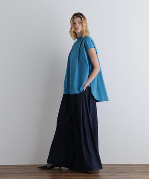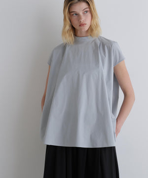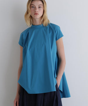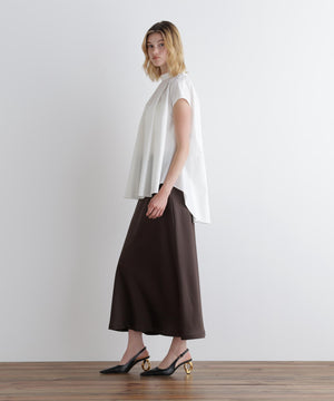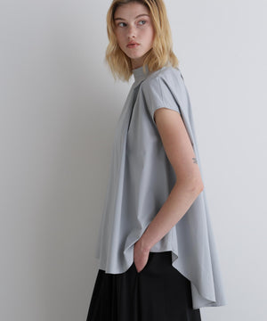素材の持つシャープさと、Aラインに広がるシルエットの女性らしさが、甘すぎない程よいバランスのブラウスです。