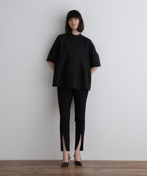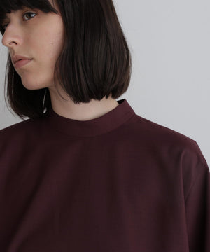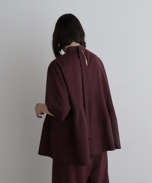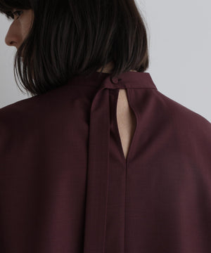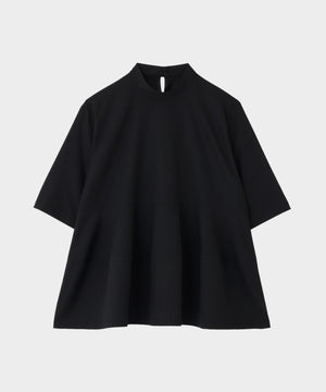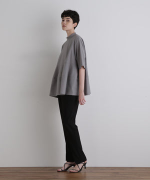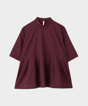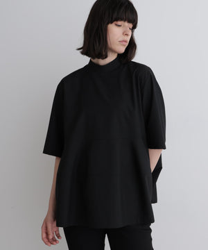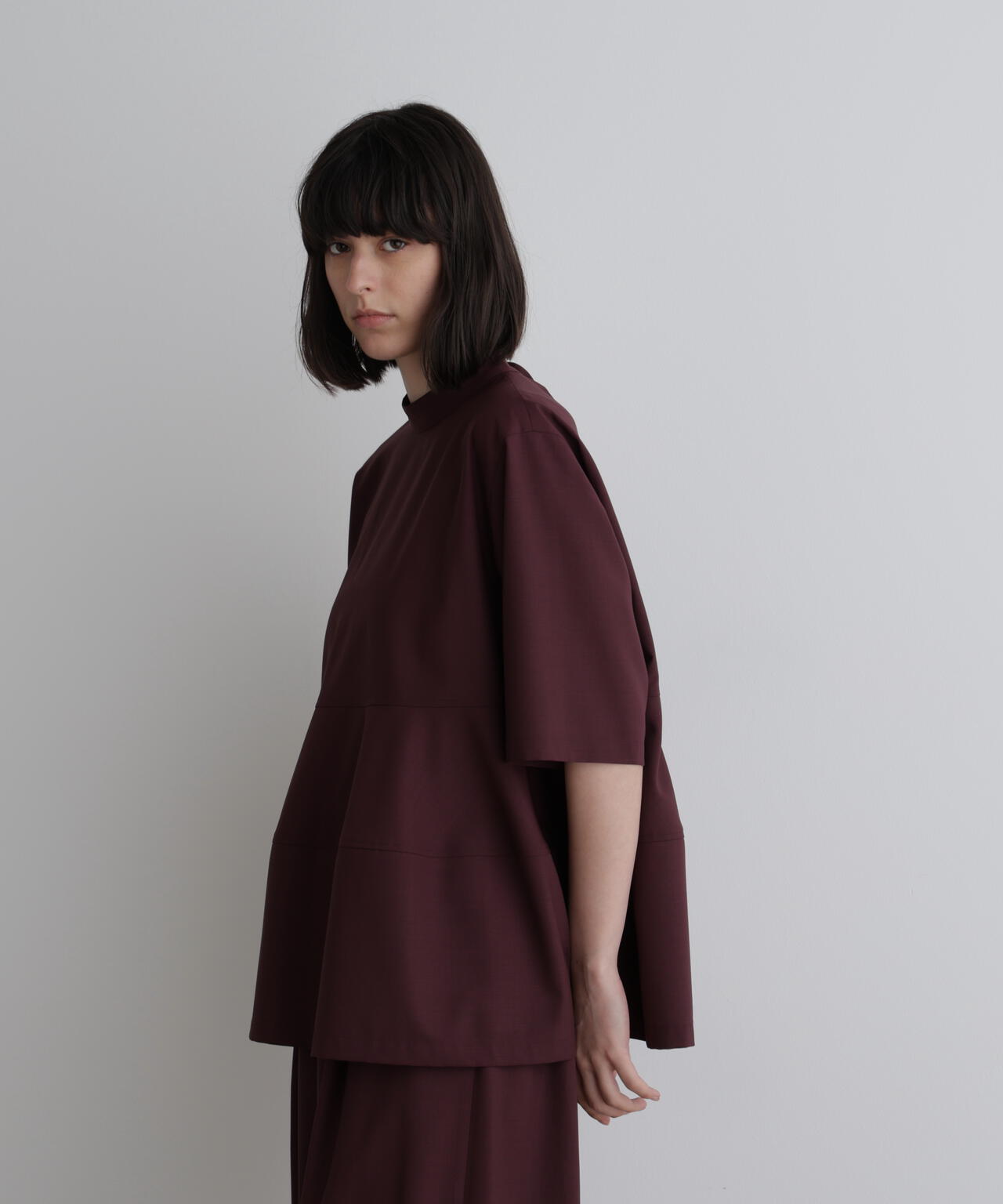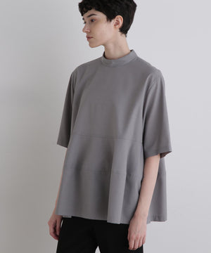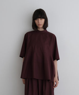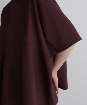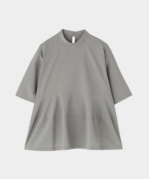 さらっとした清涼感のあるウール混素材で、晩夏から初秋にピッタリの長めの半袖ブラウスです。 一見シンプルですが、裾を構築的に切り替えてフレアーを出したモード感のあるフェミニンデザインです。