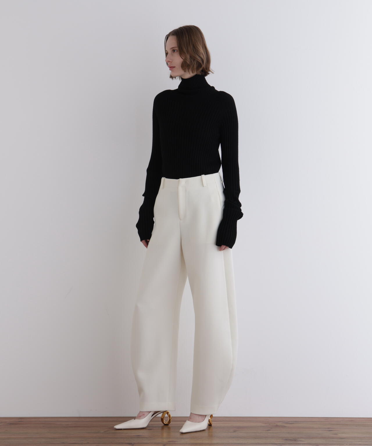 脇に施されたカーブラインが、シンプルなシルエットに動きと奥行きをもたらし、着る人の佇まいに静かなインパクトを与えます。