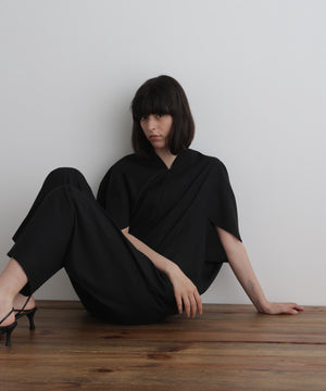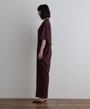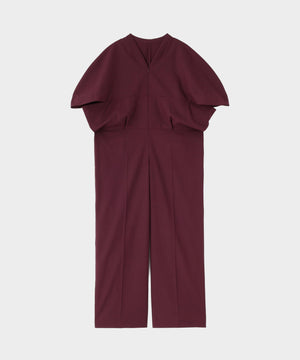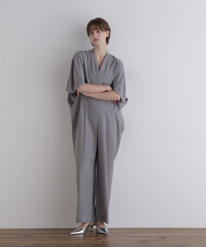 リラックスした雰囲気に偏りがちなオールインワンを高級感のある生地で仕立てることで、よりこなれ感を演出。