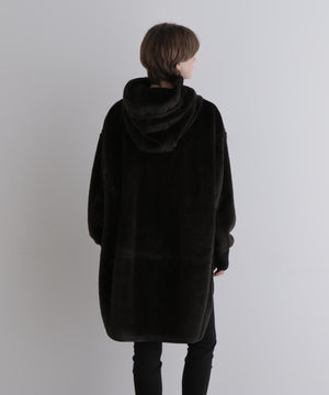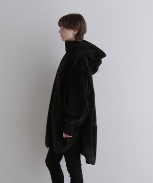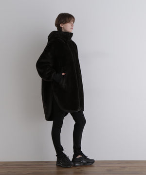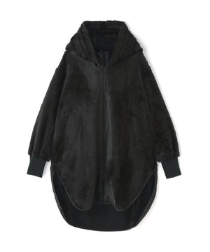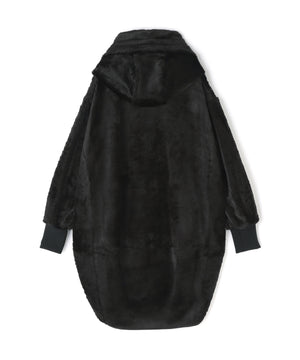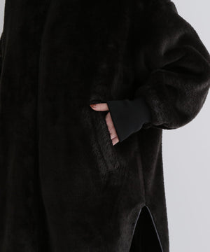 非常に滑らかでソフトな毛足のあるフェイクファーの裏に、密で膨らみのあるフリースジャージをボンディング加工で貼り合わせることで、適度な張り感とボリューム感を持たせた素材。