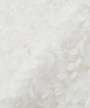 光沢と適度な張り感のあるポリエステル素材をベースに、花びらのような細かなアーチ形のテープを、細かく蛇行させて刺繍をすることで、テープを花びらのように立たせた、特殊な刺繍素材です。