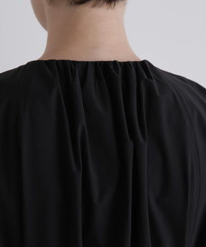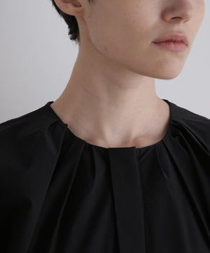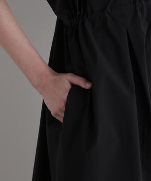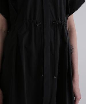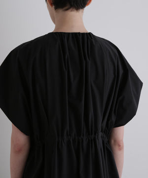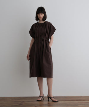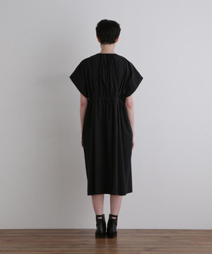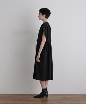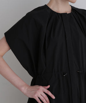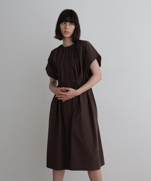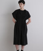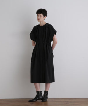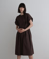 ワンピースとしてはゆったりとした身幅と、タックスリーブがモードな雰囲気を演出。