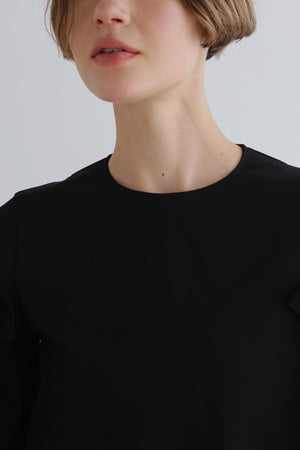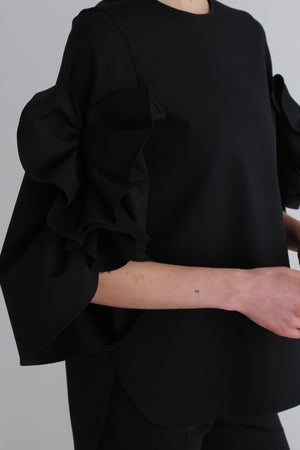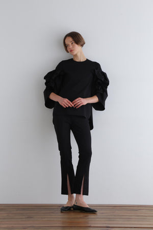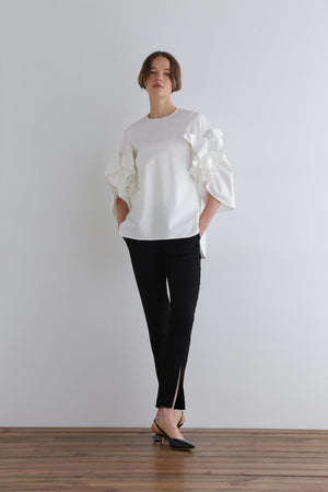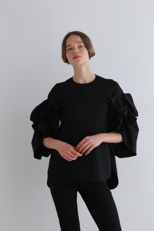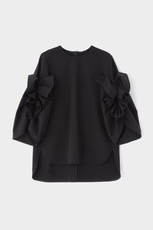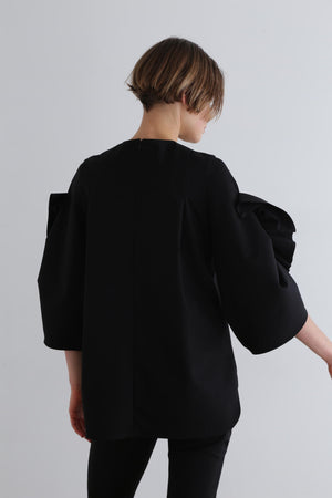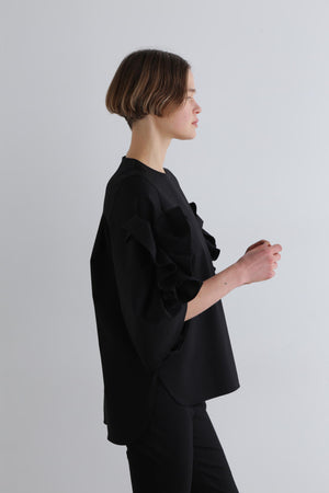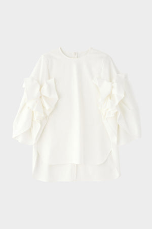 お花をイメージしたモチーフを仕立て、大胆なクチュール感あるデザインスリーブを表現したブラウス。